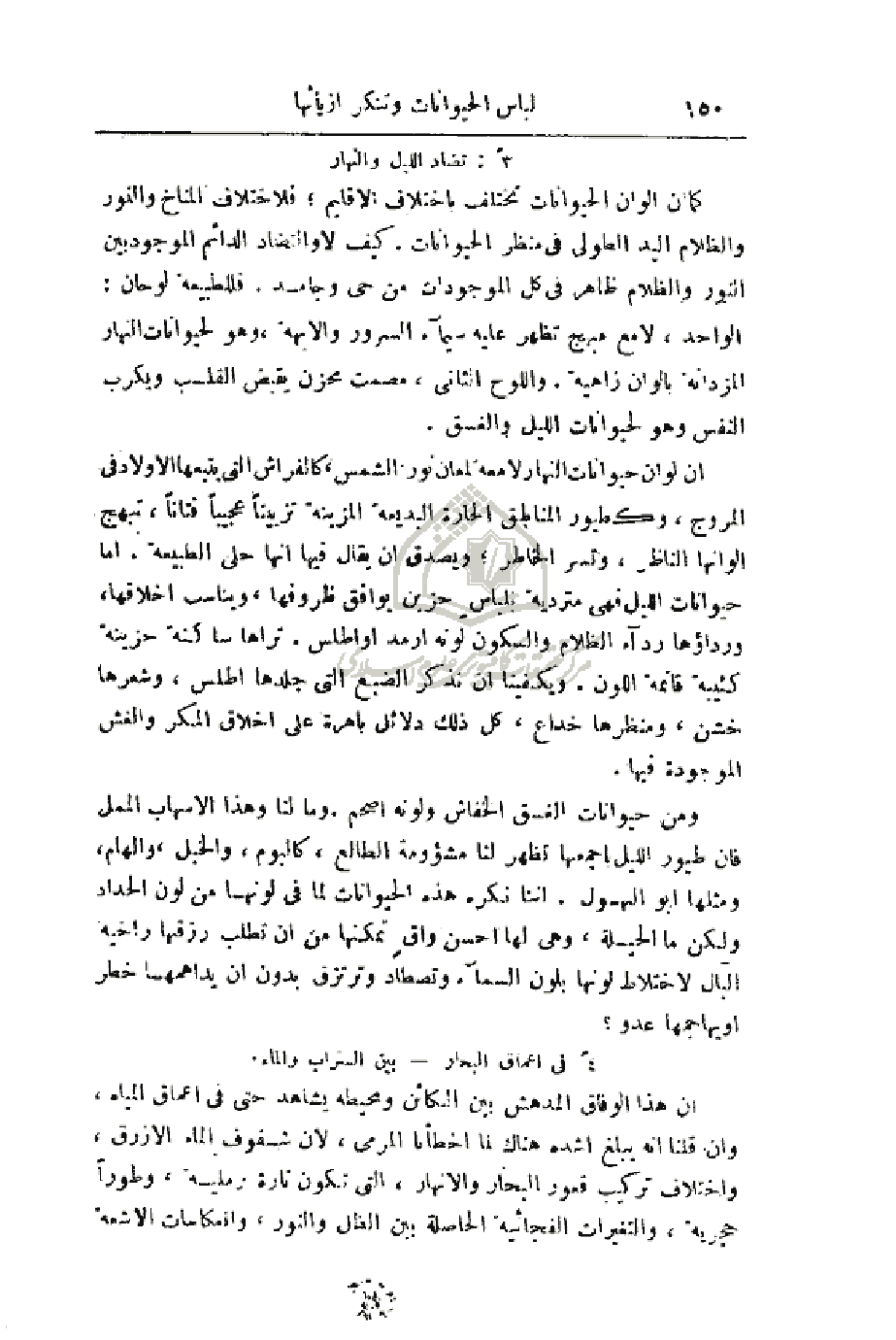 أن ألون حيوانات النهار لامعة لمعان نور الشمس، كالفراش التي يتبعها الأولاد في المروج، وكطيور المناطق الحارة البديعة المزينة تزييناً عجيباً فتاناً، تبهج ألوانها الناظر، وتسر الخاطر؛ ويصدق أن يقال فيها أنها حلي الطبيعة. أما حيوانات الليل فهي متردية بلباسٍ حزين يوافق ظروفها، ويناسب أخلاقها، ورداؤها رداء الظلام والسكون لونه ارمد أو أطلس. تراها ساكنة حزينة كئيبة قاتمة اللون. ويكفينا أن نذكر الضبع التي جلدها اطلس، وشعرها خشن، ومنظرها خداع، كل ذلك دلائل باهرة على أخلاق المكر والغش الموجودة فيها.