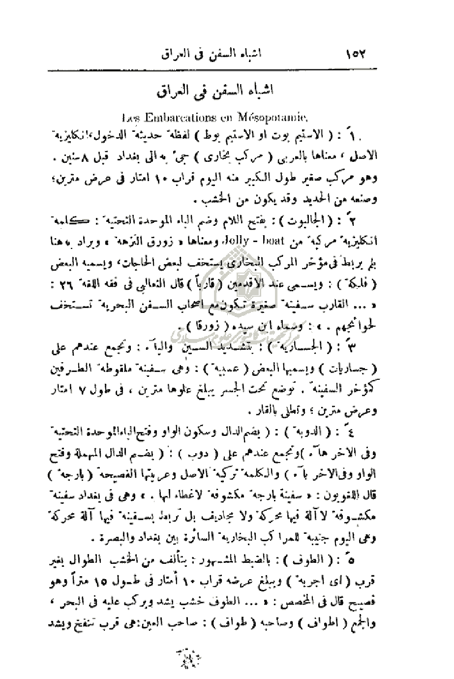 3: (الجسارية): بتشديد السين والياء: وتجمع عندهم على (جساريات) ويسميها البعض (عسبية): وهي سفينة ملقوطة الطرفين كمؤخر السفينة. توضع تحت الجسر يبلغ علوها مترين، في طول 7 أمتار وعرض مترين؛ وتطلى بالقار.