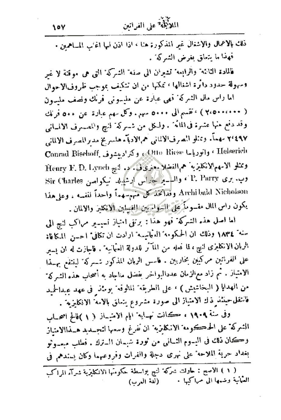 إلى 5000 سهم. وكل سهم عبارة عن 500 فرنك وقد دفع منها عشرة في المائة. ولكل من شركة لنج والمصرف الألماني2. 497 سهماً. وممثلو المصرف الألماني هم الأدباء. هلسريخ مدير المصرف الألماني واتورياسا وكنرادبيشوف وممثلو الأسهم الإنكليزية هم الفضلاء هنري ف. د. لنج وب. بري والسير جارلس ارشيبلد نيكولصن وقد اتخذ كل منهم واحداً لنفسه. وعلى هذا يكون راس المال مقسوماً على السواء بين القبيلين الإنكليز والألمان.