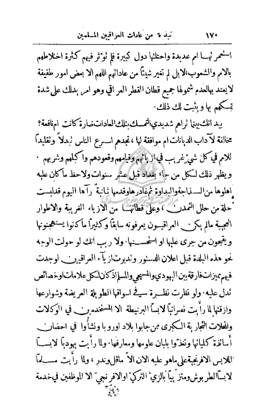 ويظهر ذلك لكل من جاءَ بغداد قبل عشر سنوات ولاحظ ما كان عليه أهلوها من السذاجة والبداوة ثم غادرها وقدمها ثانيةً رآها اليوم قد لبست حلة من حلل التمدن، وعلى قطانها من الأزياء الغريبة والأطوار العجيبة ما لم يكن العراقيون يعرفونه سابقاً وكثيراً ما كانوا يستهجنونها ويقبحون من جرى عليها أو استحسنها ولا ريب أنك لو حولت الوجه نحو هذه البلدة قبل إعلان الدستور وتدبرت أزياء العراقيين لوجدت فيهم مميزات فارقة بين اليهودي والمسيحي والمسلم إذ كان لكل علامات أو خصائص تدل عليه. ولو نظرت نظرة في أسواقها الطويلة العريضة وشوارعها وأزقتها لما رأَيت نصرانياً لابساً البرنيطة ألا