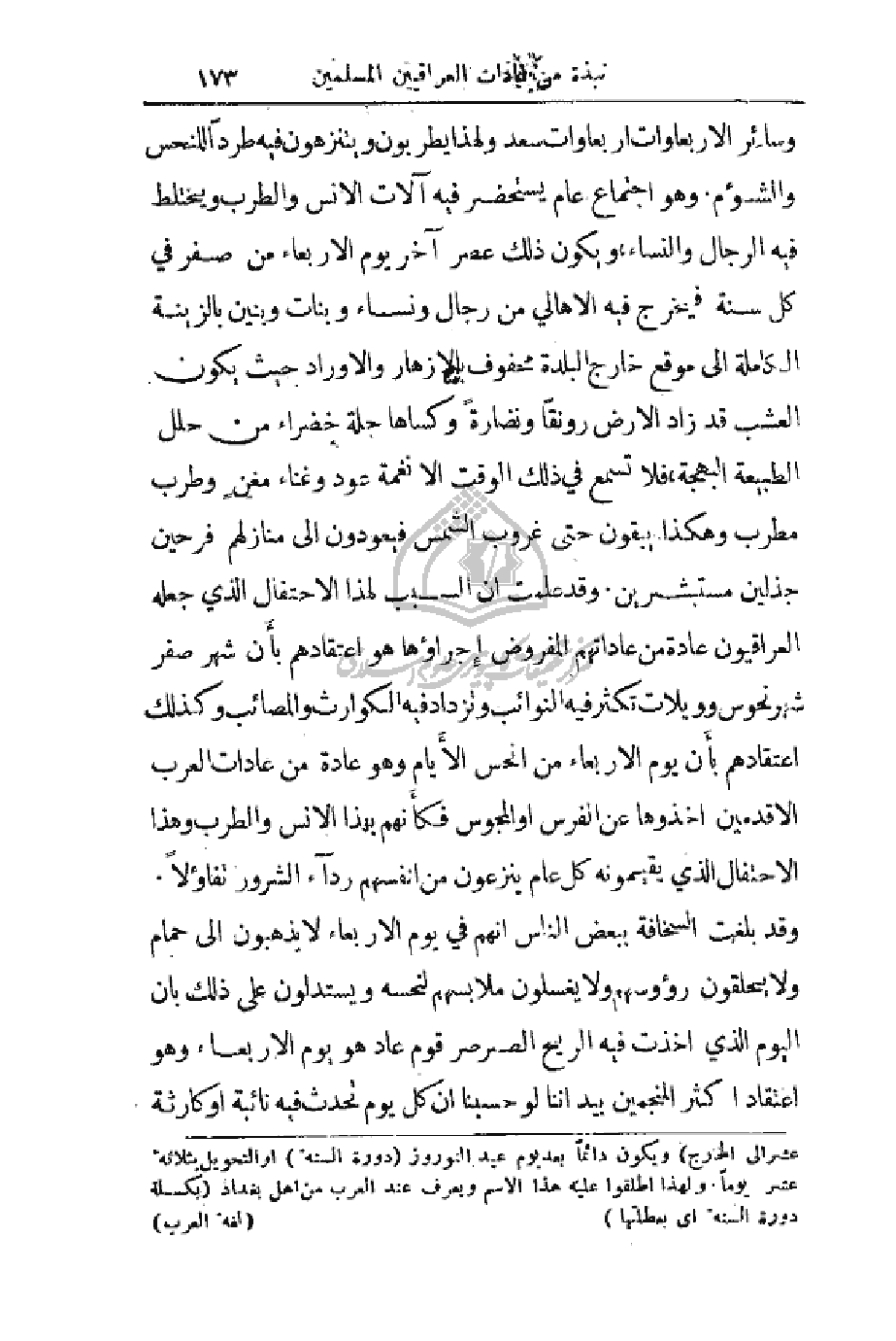 وسائر الأربعاوات أربعاوات سعد ولهذا يطربون يتنزهون فيه طرداً للنحس والشؤم. وهو اجتماع عام يستحضر فيه آلات الأنس والطرب ويختلط فيه الرجال والنساء، ويكون ذلك عصر آخر يوم الأربعاء من صفر في كل سنة فيخرج فيه الأهالي من رجال ونساء وبنات وبنين بالزينة الكاملة إلى موقع خارج البلدة محفوف بالأزهار والأوراد حيث يكون العشب قد زاد الأرض رونقاً ونضارة وكساها حلة خضراء من حلل الطبيعة البهجة، فلا تسمع في ذلك الوقت ألا نغمة عود وغناء مغنٍ وطرب مطرب وهكذا يبقون حتى غروب الشمس فيعودون إلى منازلهم فرحين جذلين مستبشرين وقد علمت أن السبب لهذا الاحتفال الذي جعله العراقيون عادة من عاداتهم المفروض إجراؤها هو اعتقادهم بأَن شهر صفر شهر نحوس وويلات تكثر فيه النوائب وتزداد فيه الكوارث والمصائب وكذلك اعتقادهم بأَن يوم الأربعاء من انحس الأيام وهو عادة من عادات العرب الأقدمين أخذوها عن الفرس أو المجوس فكأَنهم بهذا الأنس والطرب وهذا الاحتفال الذي يقيمونه كل عام ينزعون من أنفسهم رداء الشرور تفاؤلاً. وقد بلغت السخافة ببعض الناس انهم في يوم الأربعاء لا يذهبون إلى حمام ولا يحلقون رؤوسهم ولا يغسلون ملابسهم لنحسه ويستدلون على ذلك بأن اليوم الذي أخذت فيه الريح الصرصر قوم عاد هو يوم الأربعاء وهو اعتقاد اكثر المنجمين بيد أننا لو حسبنا أن كل يوم تحدث فيه نائبة أو كارثة