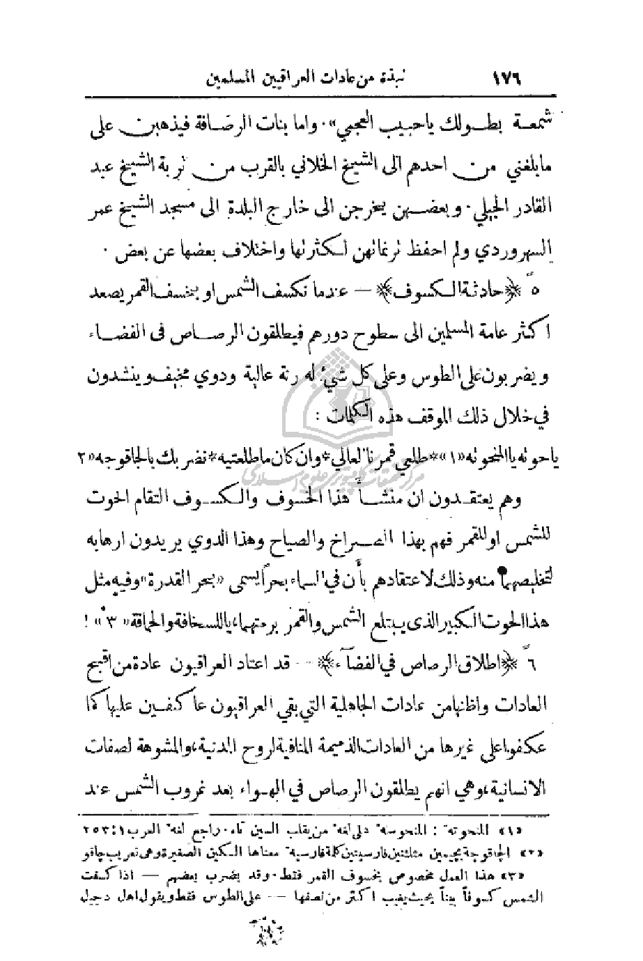 6 - (إطلاق الرصاص في الفضاء) قد اعتاد العراقيون عادة من اقبح العادات وأظنها من عادات الجاهلية التي بقي العراقيون عاكفين عليها كما عكفوا على غيرها من العادات الذميمة المنافية لروح المدنية، والمشوهة لصفات الإنسانية، وهي أنهم يطلقون الرصاص في الهواء بعد غروب الشمس عند