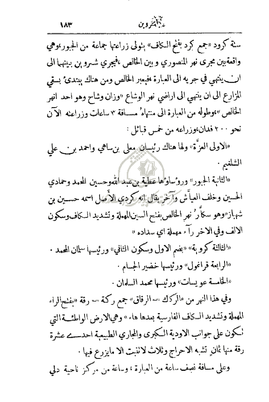 (الثانية الجبور) ورؤساؤها عطية بن عبد الله وحسين المحمد وحمادي الحسين وخلف العياش وآخر يقال إنه كردي الأصل اسمه حسين بن شهباز (وهو سكار نهر الخالص بفتح السين المهملة وتشديد الكاف وسكون الألف وفي الآخر رآء مهملة أي سداده)
