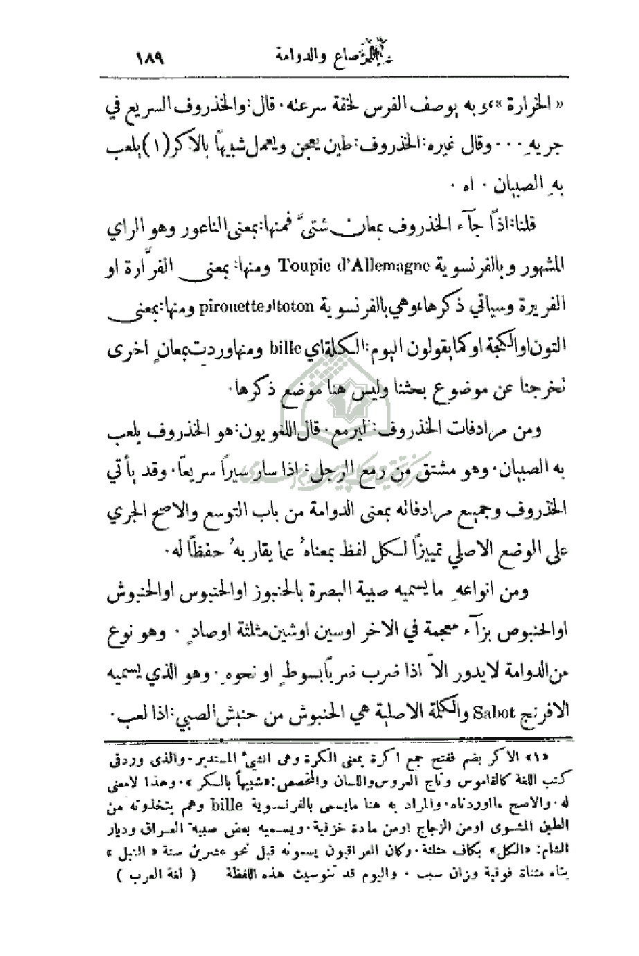 قلنا: إذا جاء الخذروف بمعان شتى فمنها بمعنى الناعور وهو الرأي المشهور وبالفرنسوية ومنها: بمعنى الفرَّارة أو الفريرة وسيأتي ذكرها، وهي أو بمعنى التون أو الكجة أو كما يقولون اليوم: الكلة أي ومنها وردت بمعانٍ أخرى تخرجنا عن موضوع بحثنا وليس هنا موضع ذكرها.