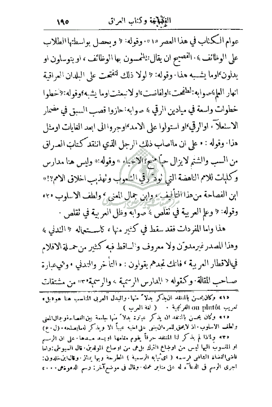 عوام الكتاب في هذا العصر وقوله (ويحصل بواسطتها الطلاب على الوظائف). الفصيح أن يقال: يلتمسون بها الوظائف، أو يتوسلون أو يدلون، أو ما يشبه هذا. وقوله: (لولا ذلك لتفتحت على البلدان العراقية انهار العلم) صوابه: لطفحت، أو لفاضت، أو لانبعثت أو ما يشبه؛ وقوله (خطوا خطوات واسعة في ميادين الرقي) صوابه: حازوا قصب السبق في مضمار الاستعلاء، أو الرقي، أو استولوا على الأمد، أو جروا إلى ابعد الغايات أو مثل هذا. وقوله: (على أن ما أصاب ذلك الرجل الذي انتقد كتاب العراق من السب والشتم لا يزال حياً منح؟ الأحياء) وقوله: (وليس هنا مدارس وكليات للأمم الناهضة التي تودّ رقي الشعوب وتهذيب أخلاق الأمم؟!) أين الفصاحة من هذا التأليف، وأين جمال المعنى، ولطف الأسلوب وقوله: (وعلم العربية في تقلص) صوابه وظل العربية في تقلص.