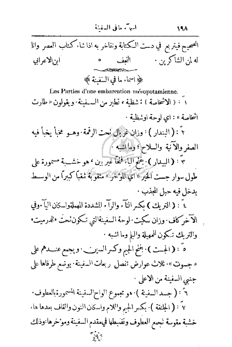 7: (الجلنقة). بكسر الجيم واللام وإسكان النون والقاف بعدها هاء. خشبة مقوسة تجمع العطوف وتضبطها في مقدم السفينة ومؤخرها: وذلك