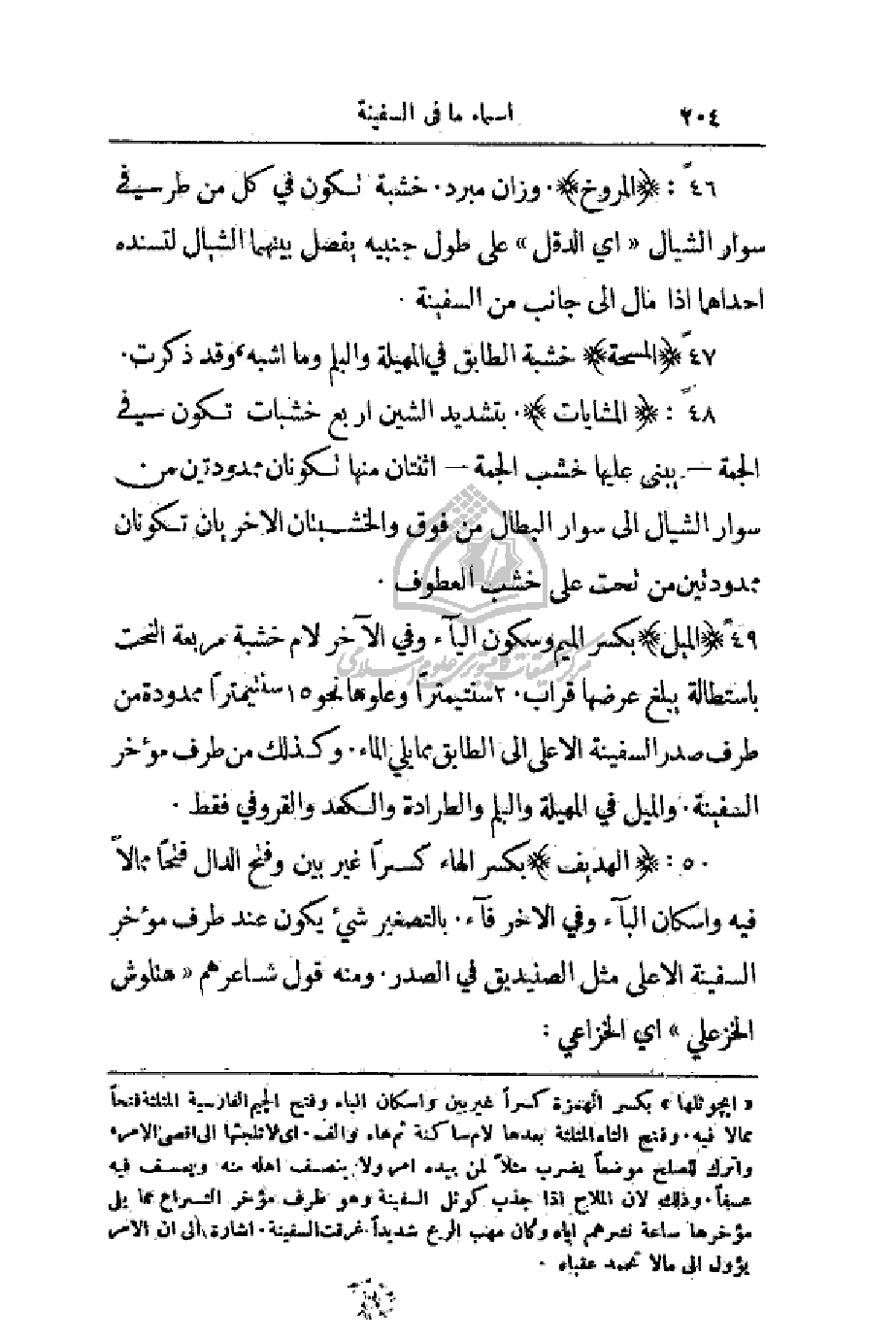 49: (الميل) بكسر الميم وسكون الياء وفي الآخر لام خشبة مربعة النحت باستطالة يبلغ عرضها قراب 20 سنتيمتراً وعلوها نحو 15 سنتيمتراً ممدودة من طرف صدر السفينة الأعلى إلى الطابق مما يلي الماء. وكذلك من طرف مؤخر السفينة. والميل في المهيلة والبلم والطرادة والكعد والقروفي فقط.