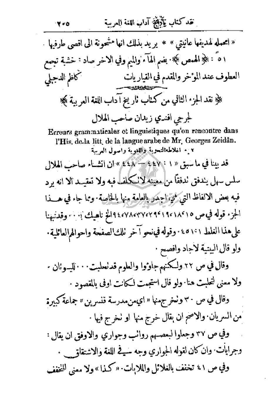 قد بينا فيما سبق (447: 1 - 448) أن إنشاء صاحب الهلال سلس سهل يتدفق تدفقاً من معينه لا تكلف فيه ولا تعقيد ألا أنه يرد فيه بعض الألفاظ التي هي اجدر بالعامة منها بالخاصة. ومما جاء في هذا الجزء قوله في ص 15، 18، 19، 29، 37، 78، 94 الخ ناهيك!. . . وقد نبهنا على هذا الغلط 451: 1. وقوله في نحو آخر تلك الصفحة وأحوالهم العائلية. ولو قال البيتية لأجاد وافصح.