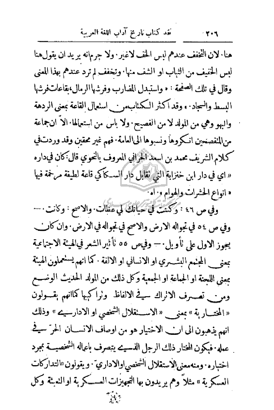 وفي ص 54 في تجواله الأرض والأصح في تجواله في الأرض. وإن كان يجوز الأول على تأويل. - وفي ص 55 تأثير الشعر في الهيئة الاجتماعية بمعنى المجتمع البشري أو الإنساني أو الألفة. كما انهم يستعملون الهيئة بمعنى اللجنة أو الجماعة أو الجمعية وكل ذلك من المولد الحديث والوضع ومن تصرف الأتراك في الألفاظ وتراكيبها كما أنهم يقولون (المختارية) بمعنى (الاستقلال الشخصي أو الإداري) وذلك أنهم يذهبون إلى أن الاختيار هو من أوصاف الإنسان الحرّ في عمله. فيكون المختار ذلك الرجل الذي يتصرف بأعماله الشخصية بمجرد اختياره. ومنه معنى الاستقلال الشخصي أو الإداري. ويقولون (التداركات العسكرية) مثلاً وهم يريدون بها التجهيزات العسكرية أو التعبئة وكل