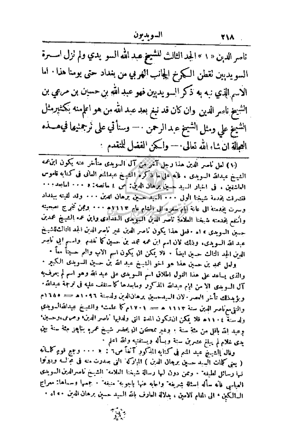 ناصر الدين الجد الثالث للشيخ عبد الله السويدي ولم تزل أسرة السويديين تقطن الكرخ الجانب الغربي من بغداد حتى يومنا هذا. أما الاسم الذي نبه به ذكر السويديين فهو عبد الله بن حسين بن مرعي بن الشيخ ناصر الدين وأن كان قد نبغ بعد عبد الله من هو اعلم منه بكثير مثل الشيخ علي ومثل الشيخ عبد الرحمن. - وسنأتي على ترجمتها في هذه العجالة إن شاء الله تعالى. - ولكن الفضل للمتقدم.
