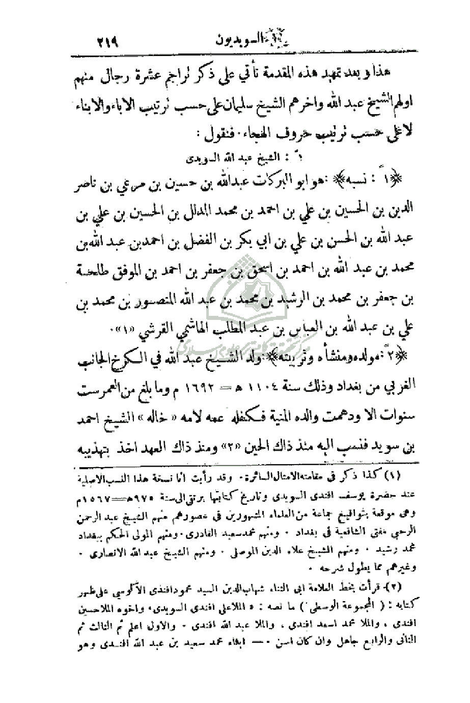 2 - : (مولده ومنشأه وتربيته): ولد الشيخ عبد الله في الكرخ الجانب الغربي من بغداد وذلك سنة 1104هـ - 1692م وما بلغ من العمر ست سنوات إلا ودهمت والده المنية فكفله عمه لامه (خاله) الشيخ احمد بن سويد فنسب إليه منذ ذاك الحين ومنذ ذاك العهد اخذ بتهذيبه
