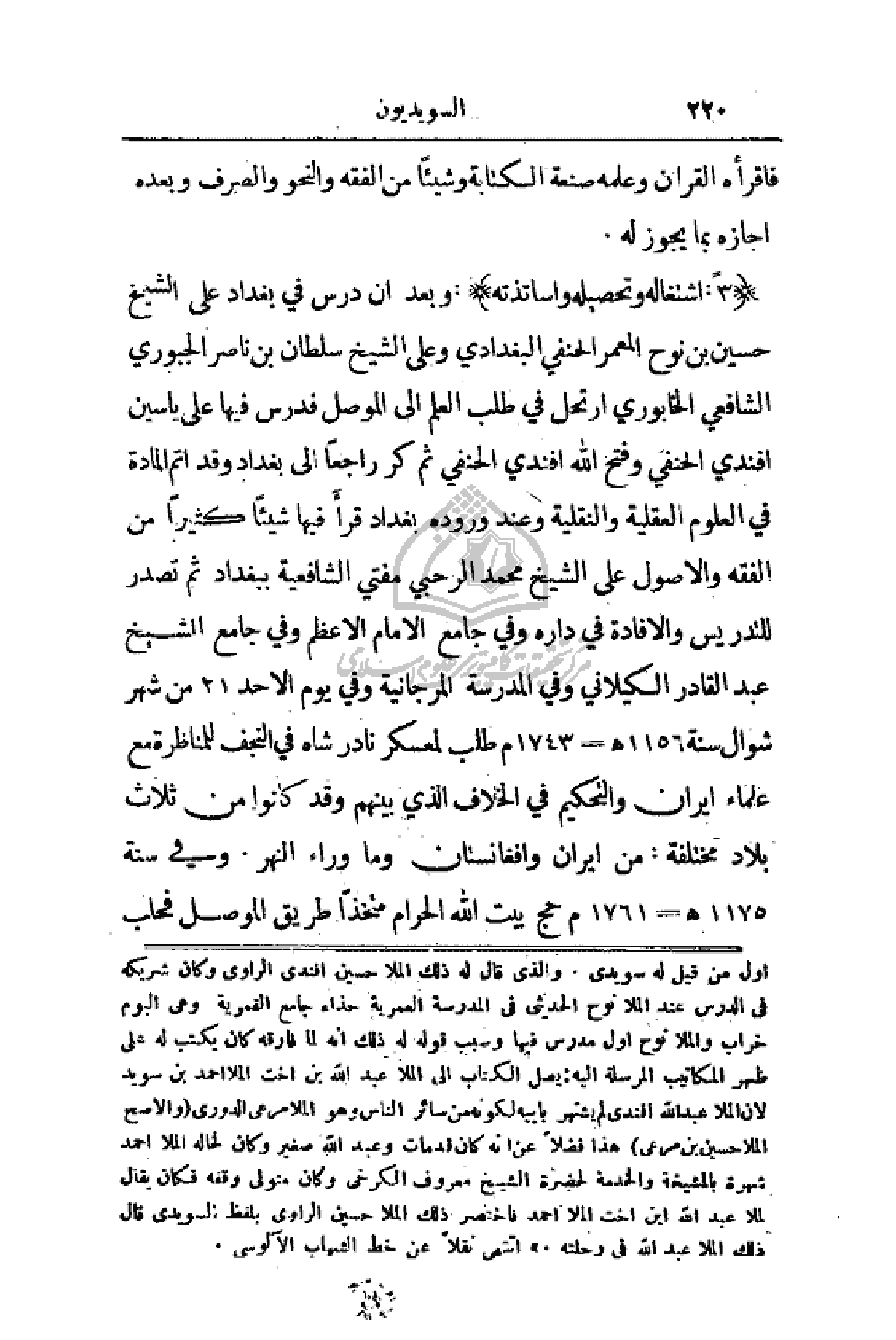 3 - : (اشتغاله وتحصيله وأساتذته): وبعد أن درس في بغداد على الشيخ حسين بن نوح المعمر الحنفي البغدادي وعلى الشيخ سلطان بن ناصر الجبوري الشافعي الخابوري ارتحل في طلب العلم إلى الموصل فدرس فيها علي ياسين أفندي الحنفي وفتح الله أفندي الحنفي ثم كر راجعاً إلى بغداد وقد أتم المادة في العلوم العقلية والنقلية وعند وروده بغداد قرأَ فيها شيئاً كثيراً من الفقه والأصول على الشيخ محمد الرحبي مفتي الشافعية ببغداد ثم تصدر للتدريس والإفادة في داره وفي جامع الشيخ عبد القادر الكيلاني وفي المدرسة المرجانية وفي يوم الأحد 21 من شهر شوال سنة 1156هـ - 1743م طلب لمعسكر نادر شاه في النجف للمناظرة مع علماء إيران والتحكيم في الخلاف الذي بينهم وقد كانوا من ثلاث بلاد مختلفة: من إيران وأفغانستان وما وراء النهر. وفي سنة 1175هـ - 1761م حج بيت الله الحرام متخذاً طريق الموصل فحلب