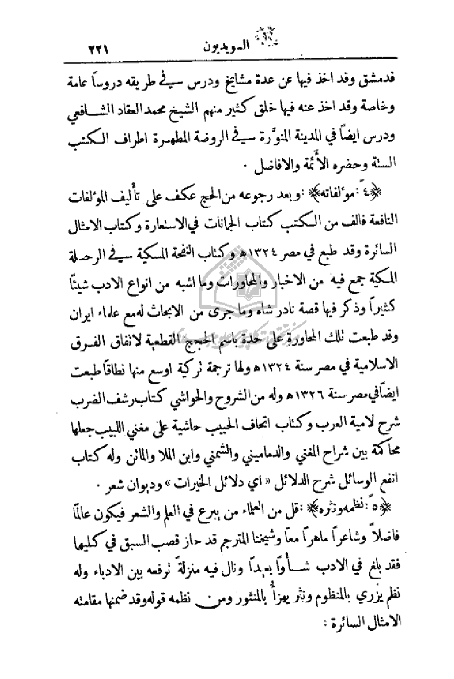 4 - (مؤلفاته): وبعد رجوعه من الحج عكف على تأْليف المؤلفات النافعة فألف من الكتب كتاب الجمانات في الاستعارة وكتاب الأمثال السائرة وقد طبع في مصر 1324هـ وكتاب النفحة المسكية في الرحلة المكية جمع فيه من الأخبار والمحاورات وما أشبه من أنواع الأدب شيئاً كثيراً وذكر فيها قصة نادر شاه وما جرى من الأبحاث له مع علماء إيران وقد طبعت تلك المحاورة على حدة باسم الحجج القطعية لاتفاق الفرق الإسلامية في مصر سنة