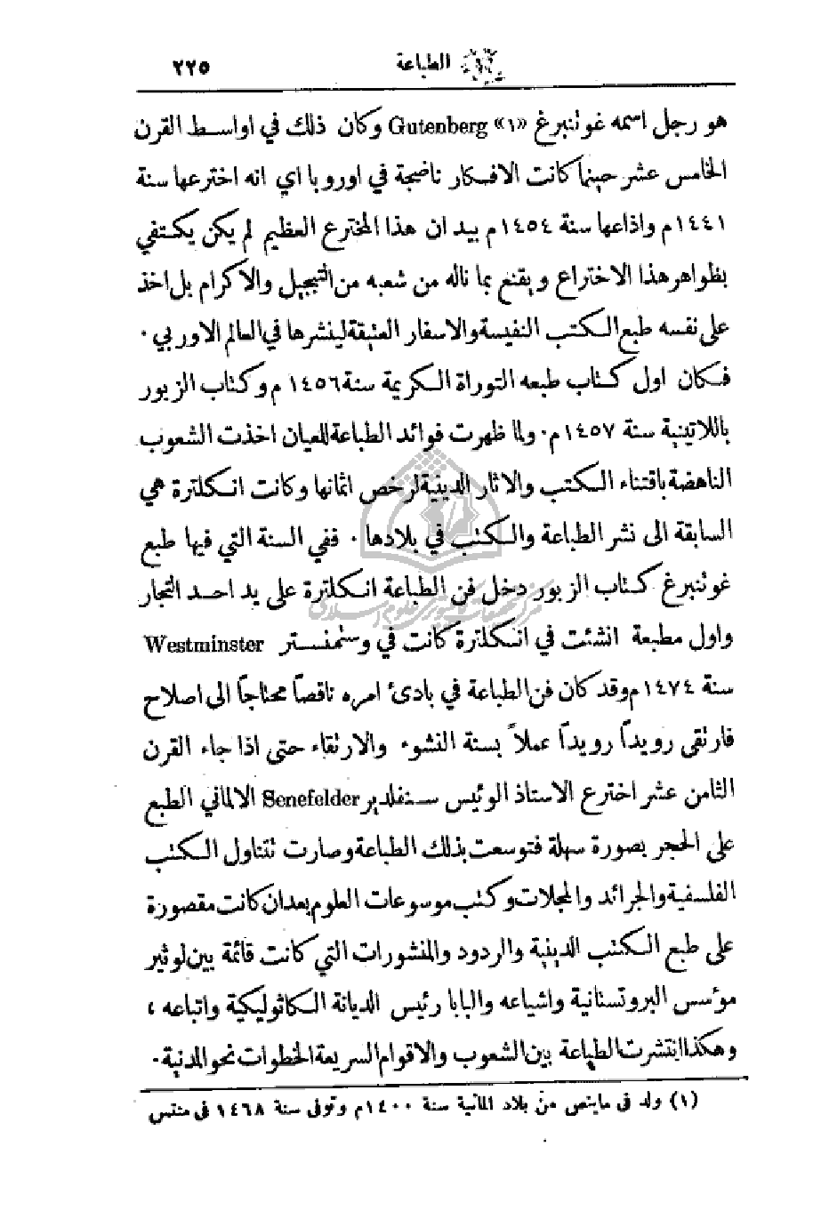 غوتنبرغ وكان ذلك في أواسط القرن الخامس عشر حينما كانت الأفكار ناضجة في أوروبا أي أنه اخترعها سنة 1441م وأذاعها سنة 1454م بيد أن هذا المخترع العظيم لم يكن يكتفي بظواهر هذا الاختراع ويقنع بما ناله من شعبه من التبجيل والإكرام بل اخذ على نفسه طبع الكتب النفيسة والأسفار العتيقة لينشرها في العالم الأوربي. فكان أول كتاب طبعه التوراة الكريمة سنة 1456م وكتاب الزبور باللاتينية سنة 1457م. ولما ظهرت فوائد الطباعة للعيان أخذت الشعوب الناهضة باقتناء الكتب والآثار الدينية لرخص أثمانها وكانت إنكلترة هي السابقة إلى نشر الطباعة والكتب في بلادها. ففي السنة التي فيها طبع غوتنبرغ كتاب الزبور دخل فن الطباعة إنكلترة على يد أحد التجار وأول مطبعة أنشئت في إنكلترة كانت في وستمنستر سنة 1474م وقد كان فن الطباعة في بادئ أمره ناقصاً محتاجاً إلى إصلاح فارتقى رويداً رويداً عملاً بسنة النشوء والارتقاء حتى إذا جاء القرن الثامن عشر اخترع الأستاذ الوئيس سنفلدير الألماني الطبع على الحجر بصورة سهلة فتوسعت بذلك الطباعة وصارت تتناول الكتب الفلسفية والجرائد والمجلات وكتب موسوعات العلوم بعد أن كانت مقصورة على طبع الكتب الدينية والردود والمنشورات التي كانت قائمة بين لوثير مؤسس البروتستانية وأشياعه والبابا رئيس الديانة الكاثوليكية واتباعه، وهكذا انتشرت الطباعة بين الشعوب والأقوام السريعة الخطوات نحو المدنية.