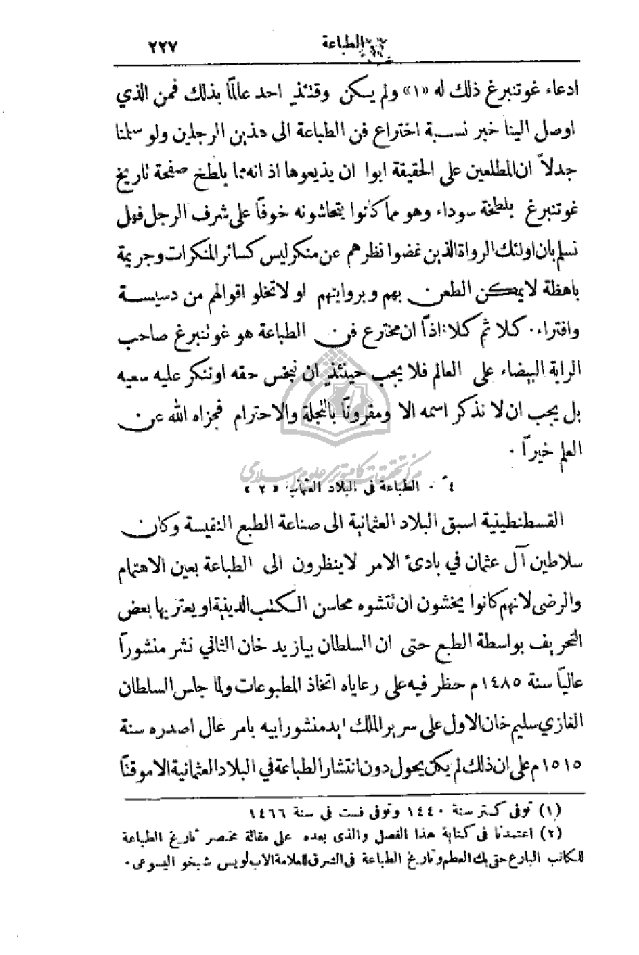 القسطنطينية اسبق البلاد العثمانية إلى صناعة الطبع النفيسة وكان سلاطين آل عثمان في بادئ الأمر لا ينظرون إلى الطباعة بعين الاهتمام والرضى لأنهم كانوا يخشون أن تتشوه محاسن الكتب الدينية أو يعتريها بعض التحريف بواسطة الطبع حتى أن السلطان بيازيد خان الثاني نشر منشوراً عالياً سنة 1485م حظر فيه على رعاياه اتخاذ المطبوعات ولما جلس السلطان الغازي سليم خان الأول على سرير الملك أيد منشور أبيه بأمر عال أصدره سنة 1515م على أن ذلك لم يكن يحول دون انتشار الطباعة في البلاد العثمانية إلا موقتاً