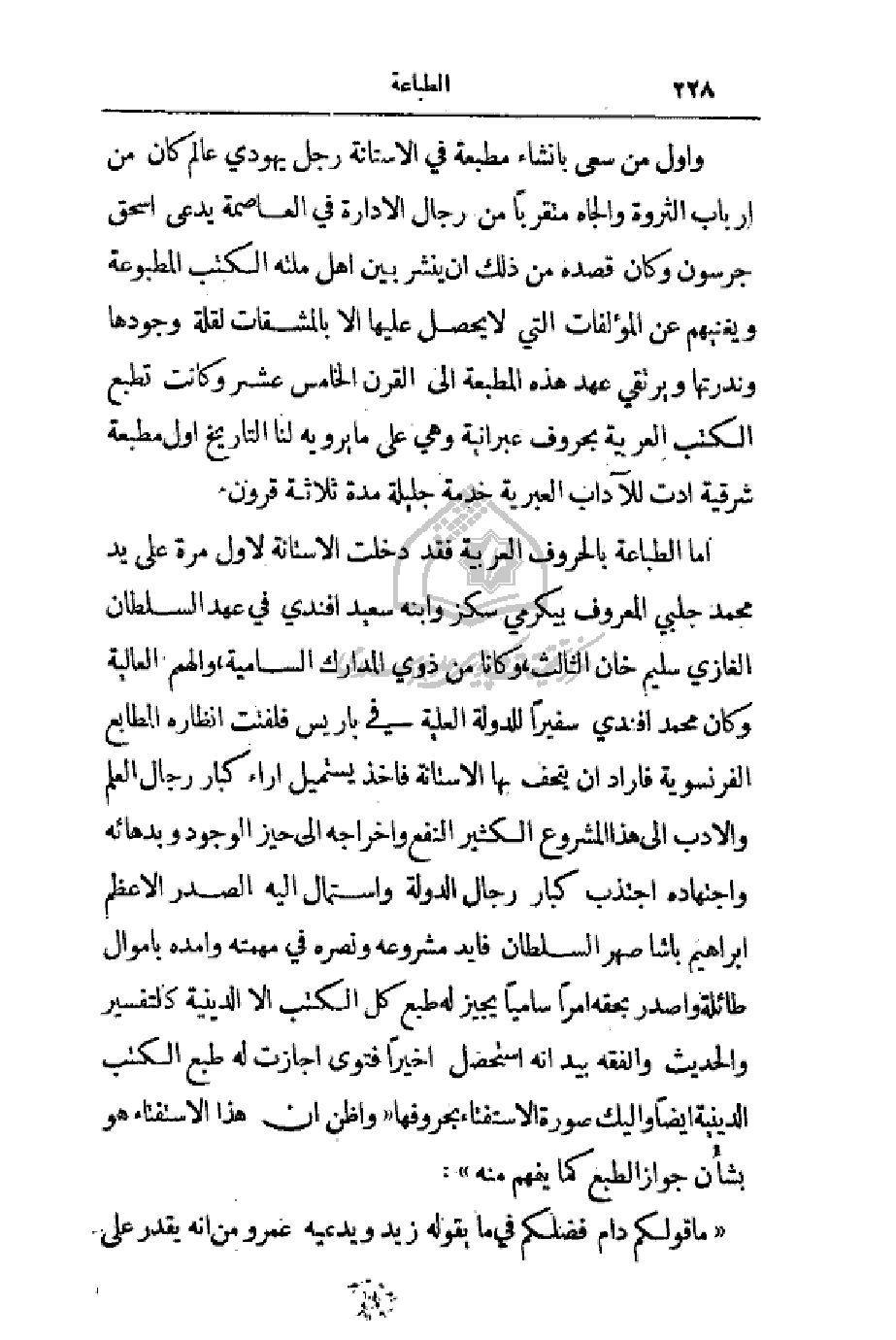 أما الطباعة بالحروف العربية فقد دخلت الأستانة لأول مرة على يد محمد جلبي المعروف بيكرمي سكز وابنه سعيد أفندي في عهد السلطان الغازي سليم خان الثالث، وكانا من ذوي المدارك السامية، والهمم العالية وكان محمد أفندي سفيراً للدولة العلية في باريس فلفتت أنظاره المطابع الفرنسوية فأراد أن يتحف بها الأستانة فاخذ يستميل أراء كبار رجال العلم والأدب إلى هذا المشروع الكثير النفع وإخراجه إلى حيز الوجود وبدهائه واجتهاده اجتذب كبار رجال الدولة واستمال إليه الصدر الأعظم إبراهيم باشا صهر السلطان فأيد مشروعه ونصره في مهمته وأمده بأموال طائلة واصدر بحقه أمراً سامياً يجيز له طبع كل الكتب إلا الدينية كالتفسير والحديث والفقه بيد أنه أستحصل أخيراً فتوى أجازت له طبع الكتب الدينية أيضاً واليك صورة الاستفتاء بحروفها (وأظن أن هذا الاستفتاء هو بشأن جواز الطبع كما يفهم منه):