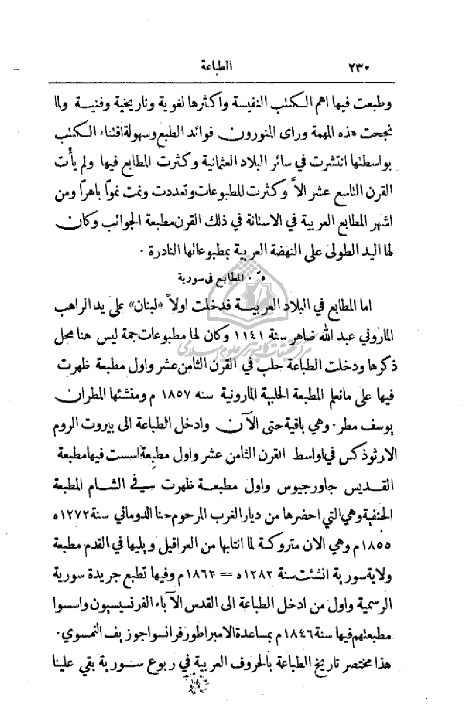 أما المطابع في البلاد العربية فدخلت أولاً (لبنان) على يد الراهب الماروني عبد الله ضاهر سنة 1141 وكان لها مطبوعات جمة ليس هنا محل ذكرها ودخلت الطباعة حلب في القرن الثامن عشر وأول مطبعة ظهرت فيها على ما نعلم المطبعة الحلبية المارونية سنة 1857م ومنشئها المطران يوسف مطر. وهي باقية حتى الآن وادخل الطباعة إلى بيروت الروم الأرثوذكس في أواسط القرن الثامن عشر وأول مطبعة أسست فيها مطبعة القديس جاورجيوس وأول مطبعة ظهرت في الشام المطبعة الحنفية وهي التي أحضرها من ديار الغرب المرحوم حنا الدوماني سنة 1272هـ 1855م وهي الآن متروكة لما انتابها من العراقيل ويليها في القدم مطبعة ولاية سورية أنشئت سنة 1282هـ - 1862م وفيها تطبع جريدة سورية الرسمية وأول من ادخل الطباعة إلى القدس الآباء الفرنسيسيون وأسسوا مطبعتهم فيها سنة 1846م بمساعدة الإمبراطور فرانسوا جوزيف النمسوي. هذا مختصر تاريخ الطباعة بالحروف العربية في ربوع سورية بقي علينا
