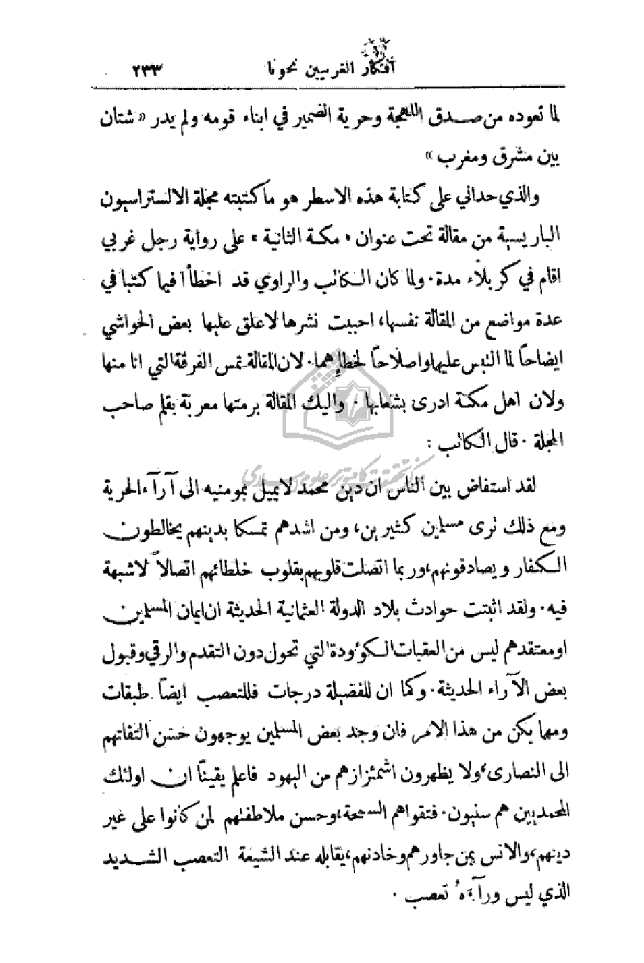 لقد استفاض بين الناس أن دين محمد لا يميل بمومنيه إلى آراء الحرية ومع ذلك ترى مسلمين كثيرين، ومن أشدهم تمسكا بدينهم يخالطون الكفار ويصادقونهم، وربما اتصلت قلوبهم بقلوب خلطائهم اتصالاً لا شبهة فيه. ولقد أثبتت حوادث بلاد الدولة العثمانية الحديثة أن إيمان المسلمين أو معتقدهم ليس من العقبات الكؤودة التي تحول دون التقدم والرقي وقبول بعض الآراء الحديثة وكما أن للفضيلة درجات فللتعصب أيضاً طبقات ومهما يكن من هذا الأمر فأن وجد بعض المسلمين يوجهون حسن التفاتهم إلى النصارى، ولا يظهرون اشمئزازهم من اليهود فاعلم يقيناً أن أولئك المحمديين هم سنيون. فتقواهم السمحة، وحسن ملاطفتهم لمن كانوا على غير دينهم، والأنس بمن جاورهم وخادنهم، يقابله عند الشيعة التعصب الشديد الذي ليس ورآءَهُ تعصب.