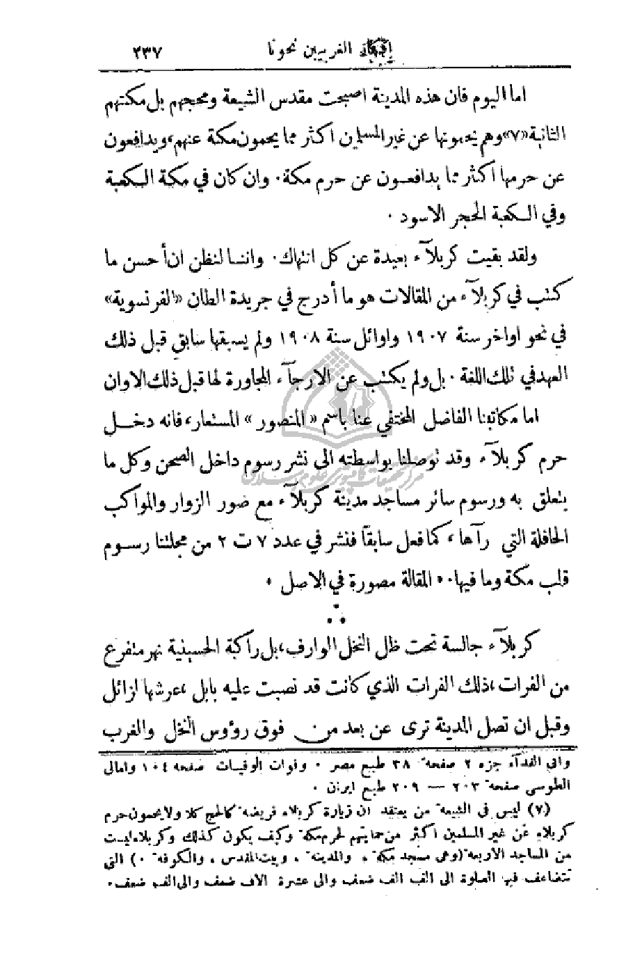 ولقد بقيت كربلاء بعيدة عن كل انتهاك. وأننا لنظن أن أحسن ما كتب في كربلاء من المقالات هو ما أدرج في جريدة الطان (الفرنسوية) في نحو أواخر سنة 1907 وأوائل سنة 1908 ولم يسبقها سابق قبل ذلك العهد في تلك اللغة. بل ولم يكتب عن الأرجاء المجاورة لها قبل ذلك الأوان