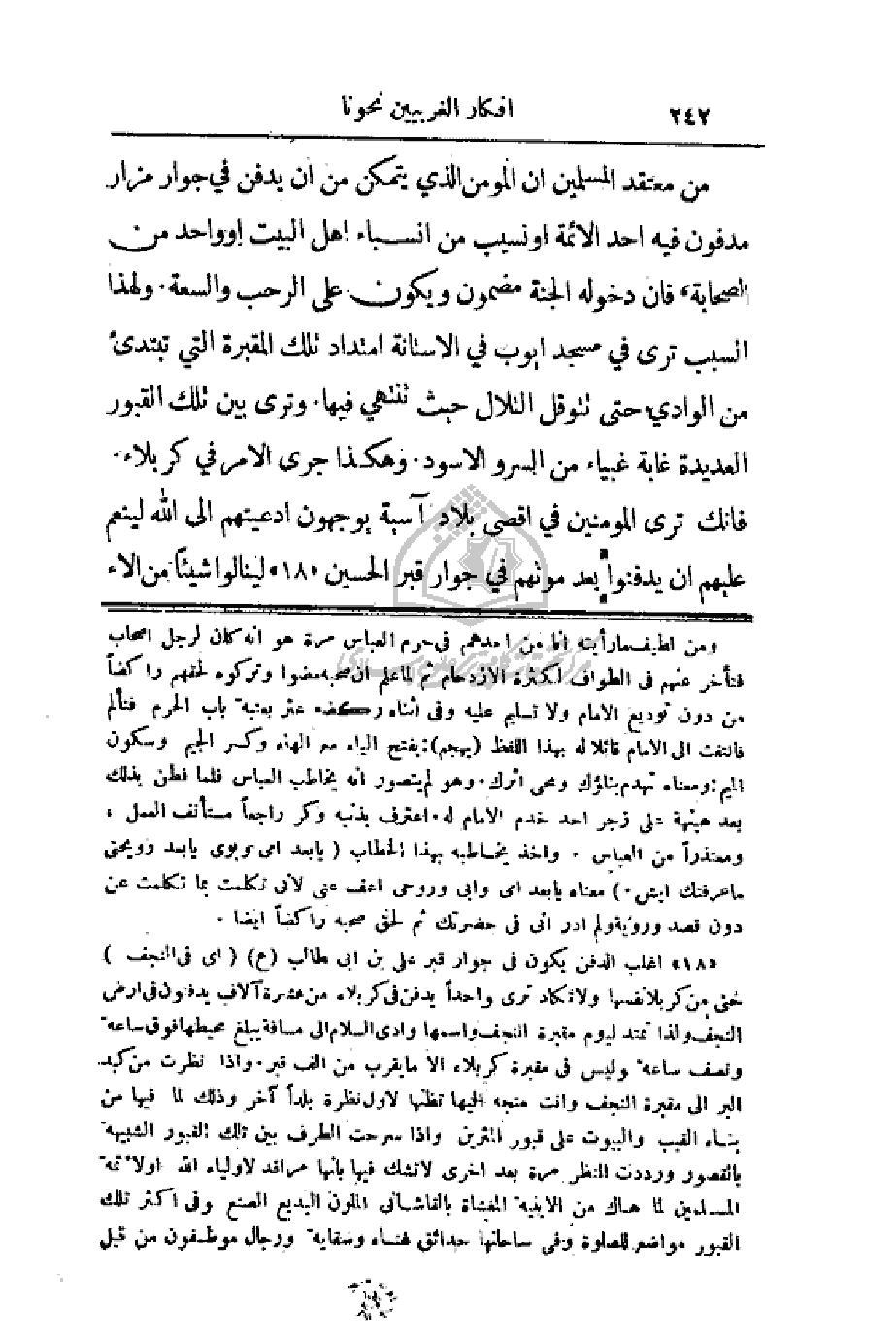 من معتقد المسلمين أن المؤمن الذي يتمكن من أن يدفن في جوار مزار مدفون فيه أحد الأئمة أو نسيب من أنسباء أهل البيت أو واحد من الصحابة، فأن دخوله الجنة مضمون ويكون على الرحب والسعة. ولهذا السبب ترى في مسجد أيوب في الأستانة امتداد تلك المقبرة التي تبتدئ من الوادي حتى تتوقل التلال حيث تنتهي فيها. وترى بين تلك القبور العديدة غابة غبياء من السرو الأسود. وهكذا جرى الأمر في كربلاء. فأنك ترى المؤمنين في أقصى بلاد آسية يوجهون أدعيتهم إلى الله لينعم عليهم أن يدفنوا بعد موتهم في جوار قبر الحسين لينالوا شيئاً من آلاء