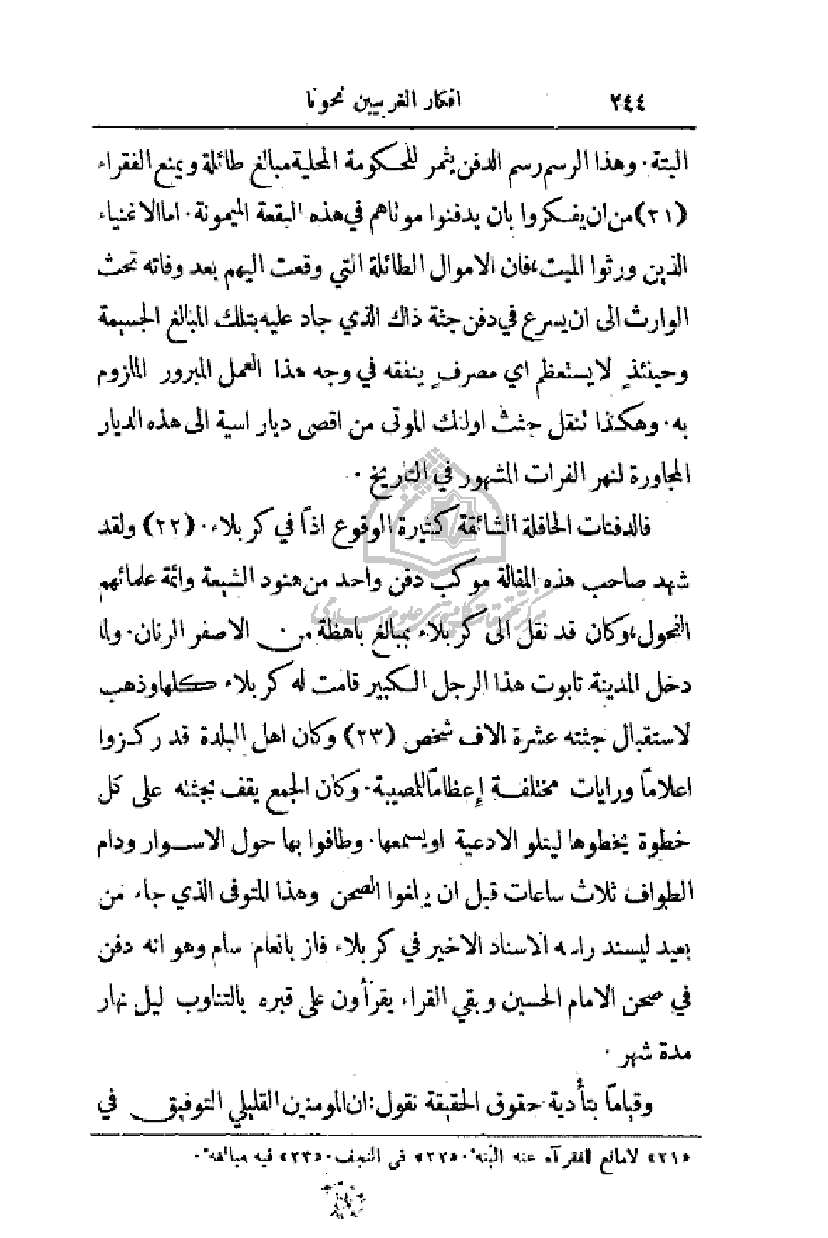 البتة. وهذا الرسم رسم الدفن. يثمر للحكومة المحلية مبالغ طائلة ويمنع الفقراء من أن يفكروا بأن يدفنوا موتاهم في هذه البقعة الميمونة. أما الأغنياء الذين ورثوا الميت، فأن الأموال الطائلة التي وقعت إليهم بعد وفاته تحث الوارث إلى أن يسرع في دفن جثة ذاك الذي جاد عليه بتلك المبالغ الجسيمة وحينئذٍ لا يستطيع أي مصرفٍ ينفقه في وجه هذا العمل المبرور الملزوم به. وهكذا تنقل جثث أولئك الموتى من أقصى ديار آسية إلى هذه الديار المجاورة لنهر الفرات المشهور في التاريخ.