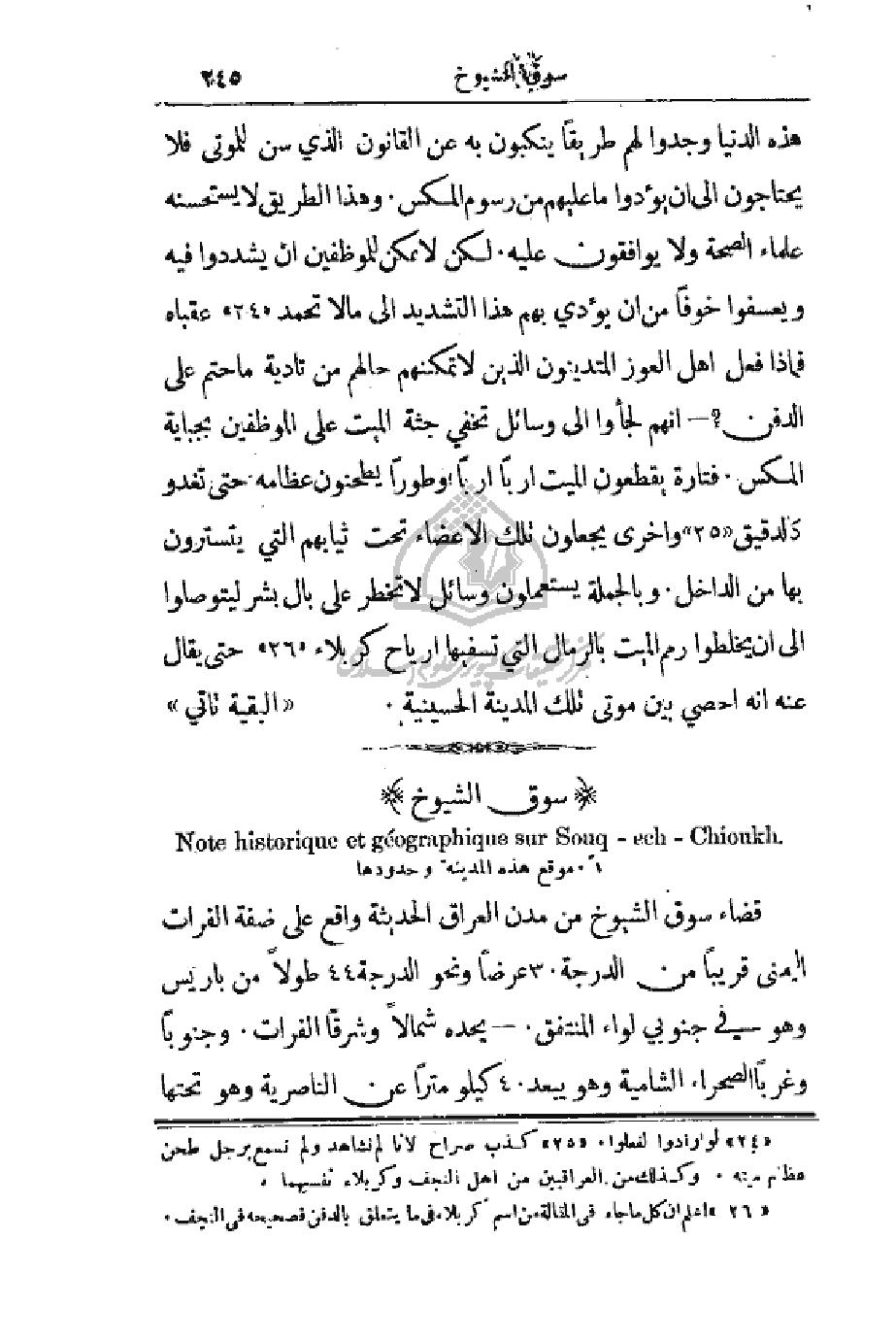 هذه الدنيا وجدوا لهم طريقاً ينكبون به عن القانون الذي سن للموتى فلا يحتاجون إلى أن يؤدوا ما عليهم من رسوم المكس. وهذا الطريق لا يستحسنه علماء الصحة ولا يوافقون عليه. لكن لا يمكن للموظفين أن يشددوا فيه ويعسفوا خوفاً من أن يؤدي بهم هذا التشديد إلى ما لا تحمد عقباه فماذا فعل أهل العوز المتدينون الذين لا تمكنهم حالهم من تادية ما حتم على الدفن؟ - أنهم لجئوا إلى وسائل تخفي جثة الميت على الموظفين بجباية المكس. فتارة يقطعون الميت أرباً أرباً، وطوراً يطحنون عظامه حتى تغدو كالدقيق وأخرى يجعلون تلك الأخطاء تحت ثيابهم التي يتسترون بها من الداخل. وبالجملة يستعملون وسائل لا تخطر على بال بشر ليتوصلوا إلى أن يخلطوا رمم الميت بالرمال التي تسفيها أرياح كربلاء حتى يقال عنه أنه أحصي بين موتى تلك المدينة الحسينية.