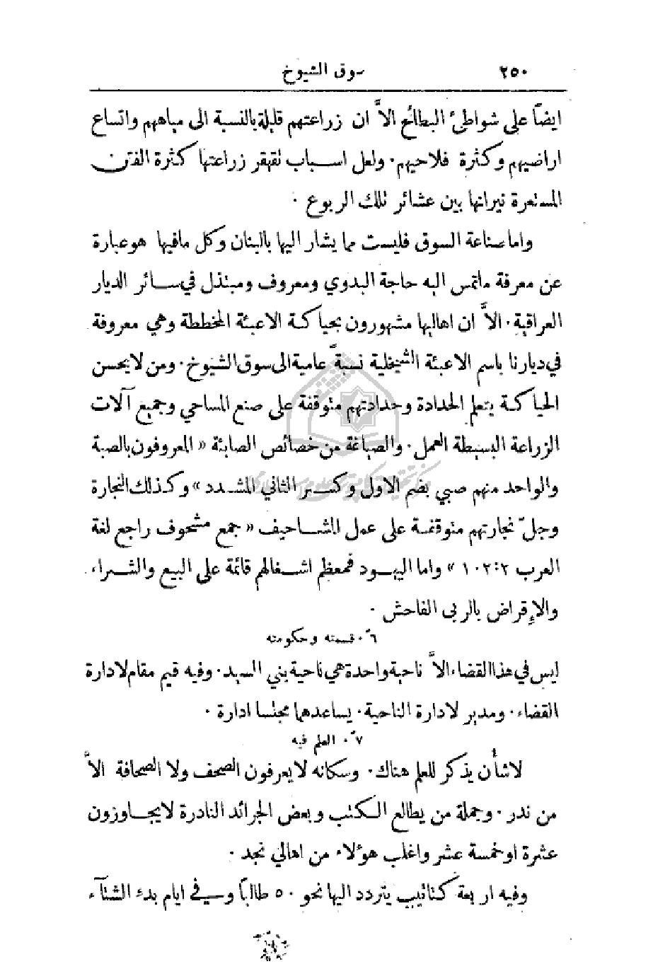 تمس إليه حاجة البدوي ومعروف ومبتذل في سائر الديار العراقية. إلاَّ أن أهاليها مشهورون بحياكة الأعبئة المخططة وهي معروفة في ديارنا باسم الاعبئة الشيخلية نسبة إلى سوق الشيوخ. ومن لا يحسن الحياكة يتعلم الحدادة وحدادتهم متوقفة على صنع المساحي وجميع آلات الزراعة البسيطة العمل. والصياغة من خصائص الصابئة (المعروفون بالصبة والواحد منهم صبي بضم الأول وكسر الثاني المشدد) وكذلك النجارة وجلّ نجارتهم متوقفة على عمل المشاحيف (جمع مشحوف راجع لغة العرب 102: 2) وأما اليهود فمعظم أشغالهم قائمة على البيع والشراء والإِقراض بالربى الفاحش.