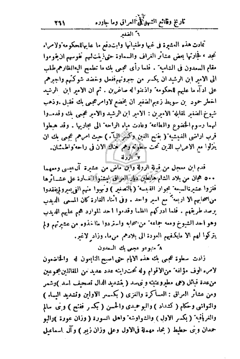 تمادت هذه العشيرة في غيها وطغيانها وأبت دفع ما عليها للحكومة ولأمراء نجد، فجارتها بعض عشائر الغراف والسماوة حتى زينت لهم نفوسهم أن يقوموا مقام السعدون في الشامية. فلما رأى عجمي بك ما تطمح إليه أنظارهم طلب إلى الأمير ابن الرشيد أن يكسر من جبروتهم ففعل وخضد شوكتهم وأجبرهم على أداء ما عليهم للحكومة وأذعنوا له صاغرين. ثم أن الأمير ابن الرشيد اخطر حمد بن سويط زعيم الضفير أن يخضع لأوامر عجمي بك فقبل. وذهب شيوخ الضفير لمقابلة الأميرين: الأمير ابن الرشيد والأمير عجمي بك وقدموا لهما رسوم الخضوع والطاعة وعادت مياه الراحة إلى مجاريها. وقد هبطوا قرب أراضي الغبيشية (بفتح الغين وكسر الباء) حيث أمرهم عجمي بك أن ينزلوا مع الأعراب الذين تحت سطوته وهم هناك الآن في راحة واطمئنان.