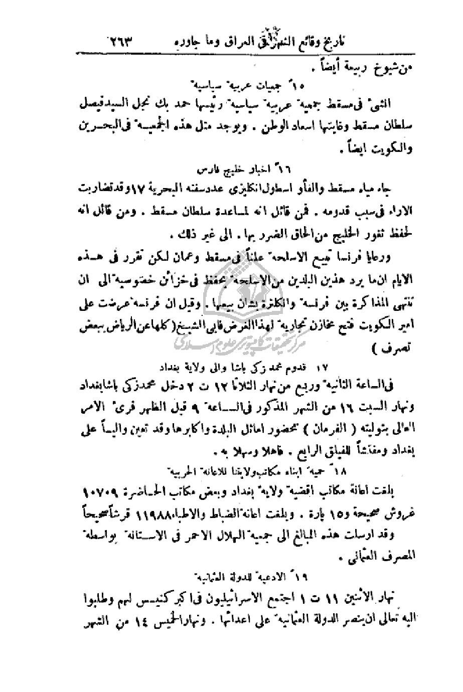أنشئ في مسقط جمعية عربية سياسية رئيسها حمد بك نجل السيد فيصل سلطان مسقط وغايتها إسعاد الوطن. ويوجد مثل هذه الجمعية في البحرين والكويت أيضاً.