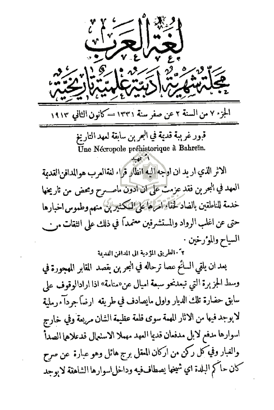 الأثر الذي أريد أن أوجه إليه أنظار قراء لغة العرب هو المدافن القديمة العهد في البحرين فقد عزمت على أن أدون ما صرح ومحض من تاريخها خدمة للناطقين بالضاد لخفاء أمرها على الكثيرين منهم وطموس أخبارها حتى عن أغلب الرواد والمستشرقين معتمداً في ذلك على الثقات من السياح والمؤرخين.