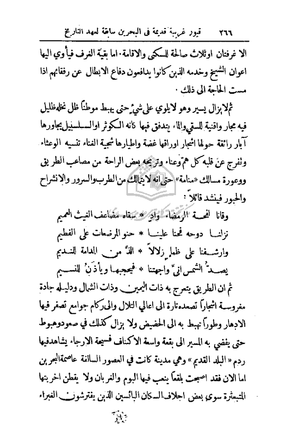 ثم أن الطريق يتعرج به ذات اليمين وذات الشمال ودليله جادة مغروسة أشجاراً تصعده تارة إلى أعالي التلال وإلى ركام جوامع تصفر فيها الأدهار وطوراً تهبط به إلى الحضيض ولا يزال كذلك في صعود وهبوط حتى يفضي به المسير إلى بقعة واسعة الأكناف فسيحة الأرجاء يشاهد فيها ردم (البلد القديم) وهي مدينة كانت في العصور السالفة عاصمة البحرين أما الآن فقد أصبحت بلقعاً ينعب فيها البوم والغربان ولا يقطن اخربتها المتبعثرة سوى بعض أجلاف السكان البائسين الذين يفترشون الغبراء