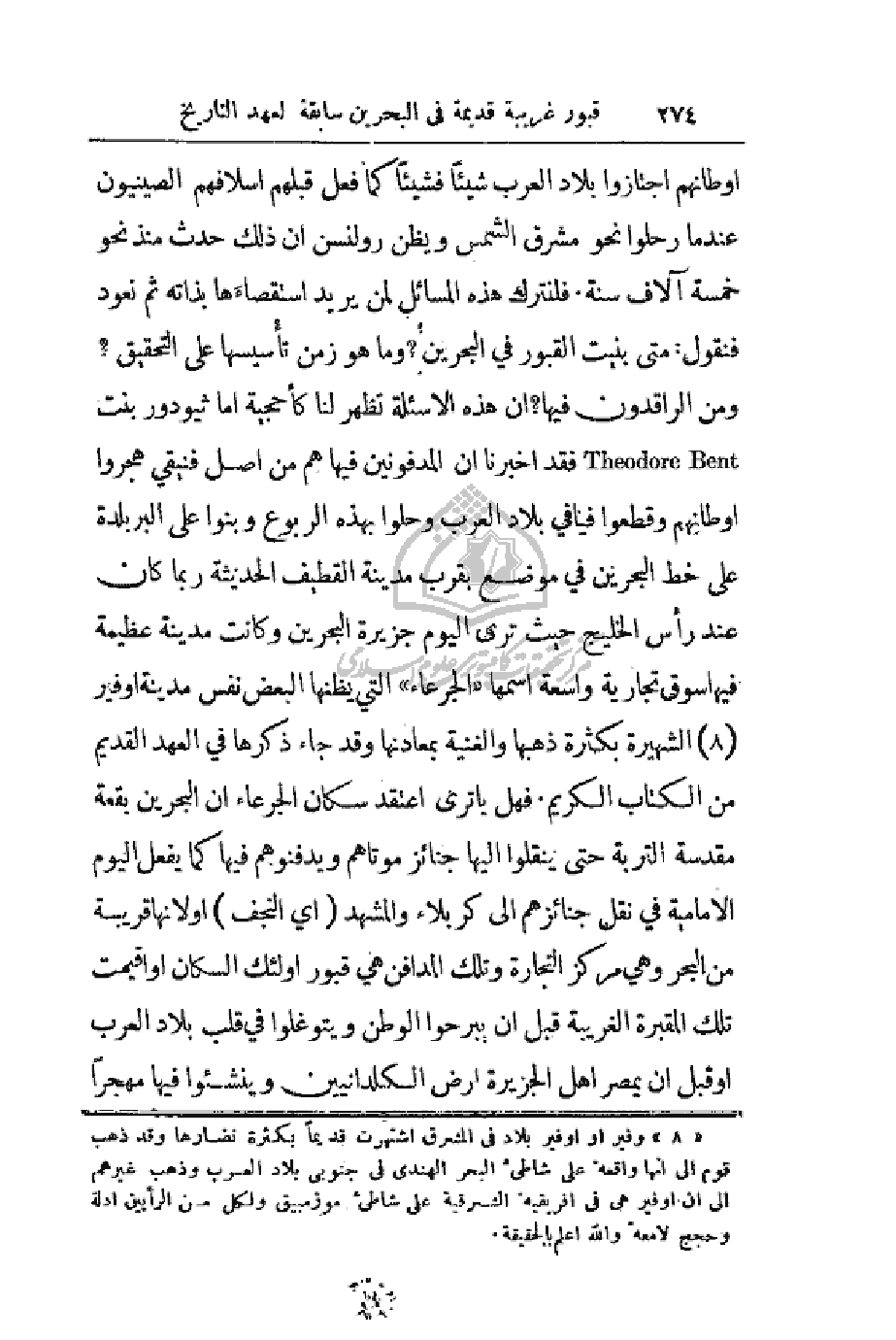 أوطانهم اجتازوا بلاد العرب شيئاً فشيئاً كما فعل قبلهم أسلافهم الصينيون عندما رحلوا نحو مشرق الشمس ويظن رولنسن أن ذلك حدث منذ نحو خمسة آلاف سنة. فلنترك هذه المسائل لمن يريد استقصاءها بذاته ثم نعود فنقول: متى بنيت القبور في البحرين؟ وما هو زمن تأسيسها على التحقيق؟ ومن الراقدون فيها؟ إن هذه الأسئلة تظهر لنا كأحجية أما ثيودور بنت فقد أخبرنا أن المدفونين فيها هم من أصل فنيقي هجروا أوطانهم وقطعوا فيا في بلاد العرب وحلوا بهذه الربوع وبنوا على البر بلدة على خط البحرين في موضع بقرب مدينة القطيف الحديثة ربما كان عند رأس الخليج حيث ترى اليوم جزيرة البحرين وكانت مدينة عظيمة فيها سوق تجارية واسعة اسمها (الجرعاء) التي يظنها البعض نفس مدينة أوفير الشهيرة بكثرة ذهبها والغنية بمعادنها وقد جاء ذكرها في العهد القديم من الكتاب الكريم. فهل يا ترى اعتقد سكان الجرعاء أن البحرين بقعة مقدسة التربة حتى ينقلوا إليها جنائز موتاهم ويدفنوهم فيها كما يفعل اليوم الإمامية في نقل جنائزهم إلى كربلاء والمشهد (أي النجف) أو لأنها قريبة من البحر وهي مركز التجارة وتلك المدافن هي قبور أولئك السكان أو أقيمت تلك المقبرة الغريبة قبل أن يبرحوا الوطن ويتوغلوا في قلب بلاد العرب أو قبل أن يمصر أهل الجزيرة أرض الكلدانيين وينشئوا فيها مهجراً