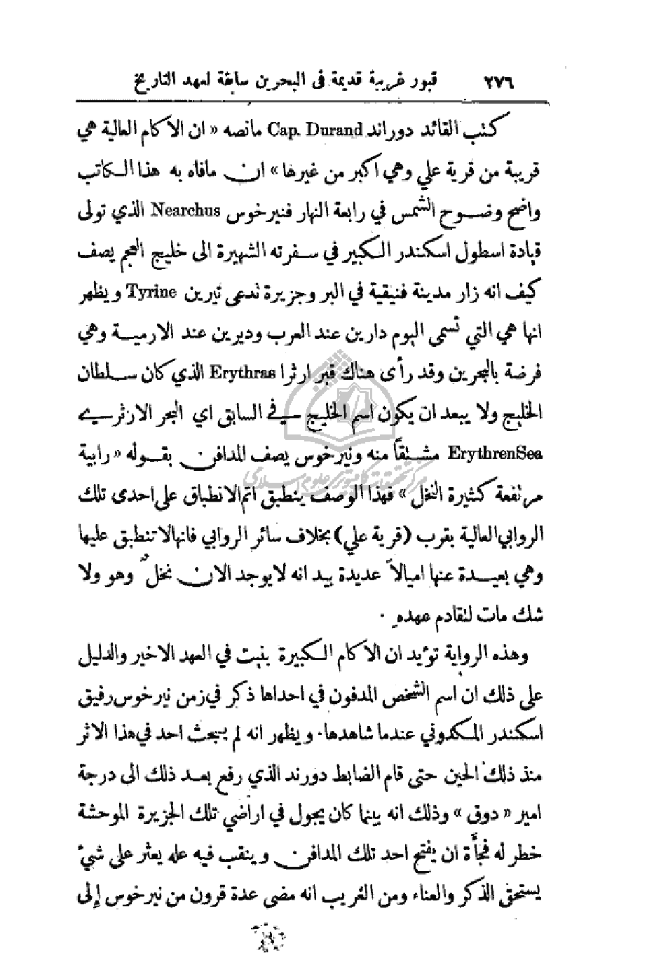 كتب القائد دوراند ما نصه (إن الآكام العالية هي قريبة من قرية علي وهي أكبر من غيرها) إن ما فاه به هذا الكاتب واضح وضوح الشمس في رابعة النهار فنيرخوس الذي تولى قيادة أسطول اسكندر الكبير في سفرته الشهيرة إلى خليج العجم يصف كيف أنه زار مدينة فنيقية في البر وجزيرة تدعى تيرين ويظهر أنها هي التي تسمى اليوم دارين عند العرب وديرين عن الأرمية وهي فرضة بالبحرين وقد رأى هناك قبر ارثرا الذي كان سلطان الخليج ولا يبعد أن يكون اسم الخليج في السابق أي البحر الارثري مشتقاً منه ونيرخوس يصف المدافن بقوله (رابية مرتفعة كثيرة النخل) فهذا الوصف ينطبق أتم الانطباق على إحدى تلك الروابي العالية بقرب (قرية علي) بخلاف سائر الروابي فأنها لا