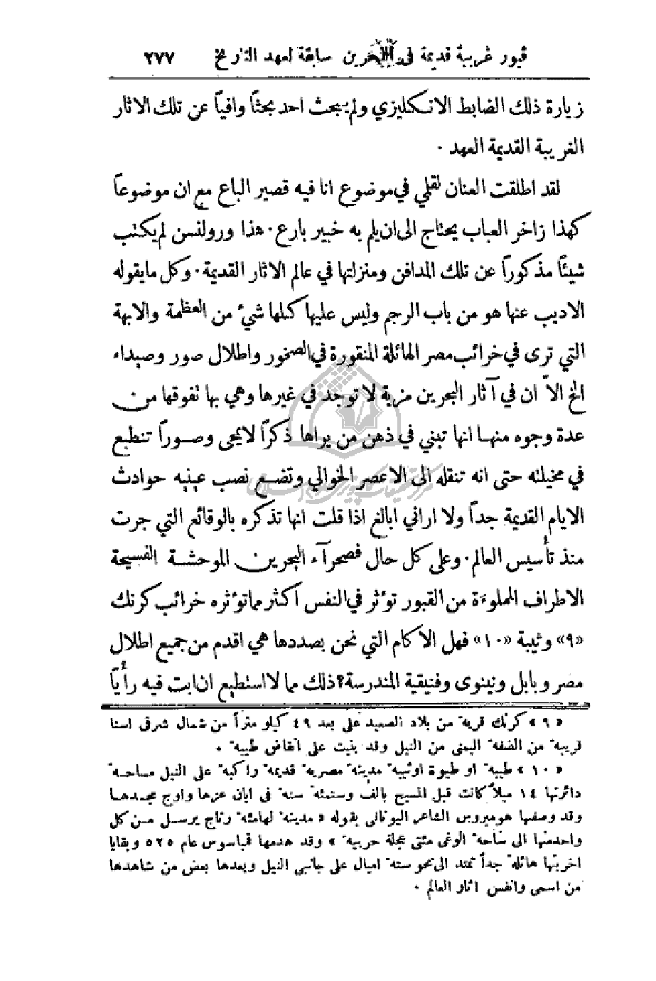 لقد أطلقت العنان لقلمي في موضوع أنا فيه قصير الباع مع أن موضوعاً كهذا زاخر العباب يحتاج إلى أن يلم به خبير بارع. هذا ورولنسن لم يكتب شيئاً مذكوراً عن تلك المدافن ومنزلتها في عالم الآثار القديمة. وكل ما يقوله الأديب عنها هو من باب الرجم وليس عليها كلها شيء من العظمة والأبهة التي ترى في خرائب مصر الهائلة المنقورة في الصخور وأطلال صور وصيداء الخ إلا أن في آثار البحرين مزية لا توجد في غيرها وهي بها تفوقها من عدة وجوه منها أنها تبني في ذهب من يراها ذكراً لا محيى وصوراً تنطبع في مخيلته حتى أنه تنقله إلى الأعصر الخوالي وتضع نصب عينيه حوادث الأيام القديمة جداً ولا أراني أبالغ إذا قلت إنها تذكره بالوقائع التي جرت منذ تأسيس العالم. وعلى كل حال فصحراء البحرين الموحشة الفسيحة الأطراف المملوءة من القبور تؤثر في النفس أكثر مما تؤثره خرائب كرنك وثيبة فهل الآكام التي نحن بصددها هي أقدم من جميع أطلال مصر وبابل ونينوى وفينيقية المندرسة؟ ذلك مما لا أستطيع أن أبت فيه رأياً