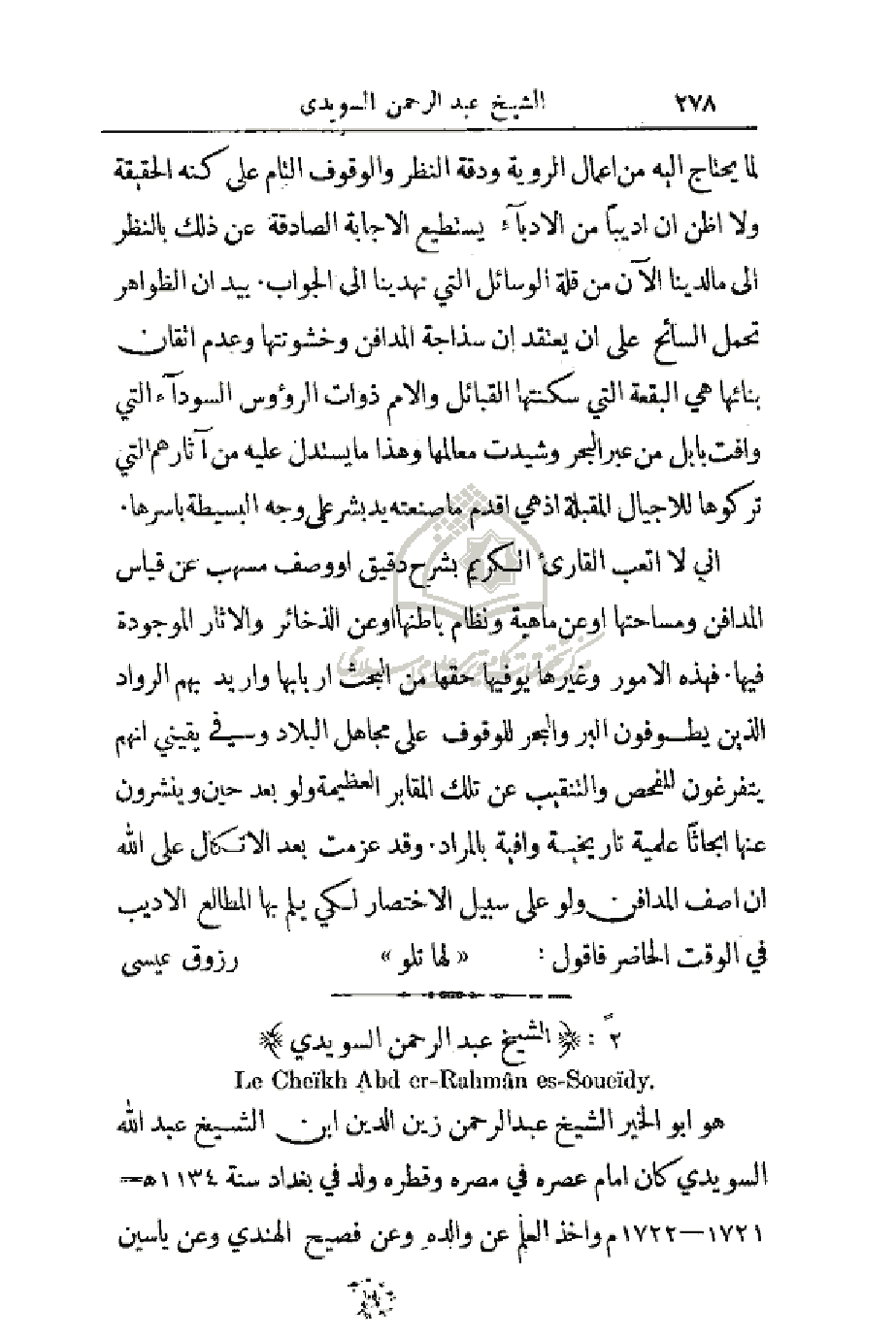 لما يحتاج إليه من أعمال الروية ودقة النظر والوقوف التام على كنه الحقيقة ولا أظن أن أديباً من الأدباء يستطيع الإجابة الصادقة عن ذلك بالنظر إلى ما لدينا الآن من قلة الوسائل التي تهدينا إلى الجواب. بيد أن الظواهر تحمل السائح على أن يعتقد أن سذاجة المدافن وخشونتها وعدم إتقان بنائها هي البقعة التي سكنتها القبائل والأمم ذوات الرؤوس السوداء التي وافت بابل من عبر البحر وشيدت معالمها وهذا ما يستدل عليه من آثارهم التي