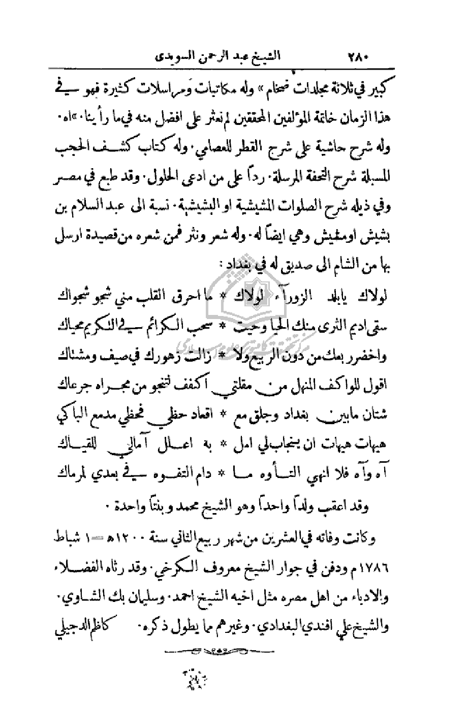 كبير في ثلاثة مجلدات ضخام) وله مكاتبات ومراسلات كثيرة فهو في هذا الزمان خاتمة المؤلفين المحققين لم نعثر على أفضل منه في ما رأينا) اهـ. وله شرح حاشية على شرح القطر للعصامي. وله كتاب كشف الحجب المسبلة شرح التحفة المرسلة. رداً على من ادعى الحلول. وقد طبع في مصر وفي ذيله شرح الصلوات المشيشية أو البشيشية. نسبة إلى عبد السلام بن بشيش أو مشيش وهي أيضاً له. وله شعر ونثر فمن شعره من قصيدة أرسل بها من الشام إلى صديق له في بغداد:
