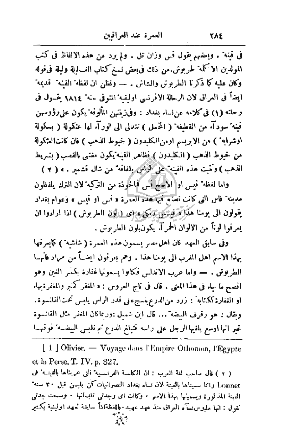 في فينة. وبعضهم يقول فس وزان تل. ولم يرد من هذه الألفاظ في كتب المولدين إلا كلمة طربوش. من ذلك في بعض نسخ كتاب ألف ليلة وليلة في قوله وكان عليه كما ذكرنا الطربوش والشاش. - ونظن أن لفظة الفينة قديمة أيضاً في العراق لأن الرحالة الإفرنسي أوليفية المتوفى سنة 1814 يقول في رحلته في كلامه عن نساء بغداد: وفي زينتهن المألوفة يكون على رؤوسهن فينة سوداء من القطيفة (المخمل) تتدلى إلى الوراء لها عثكولة (بسكولة أو شرابة) من الإبريسم أو من الكلبدون (خيوط الذهب) فإن كانت العثكولة من خيوط الذهب (الكلبدون) فظاهر الفينة يكون مغشى بالقصب (بشريط الذهب) وتثبت هذه الفينة على الرأس بلفافة من شال قشمير.)