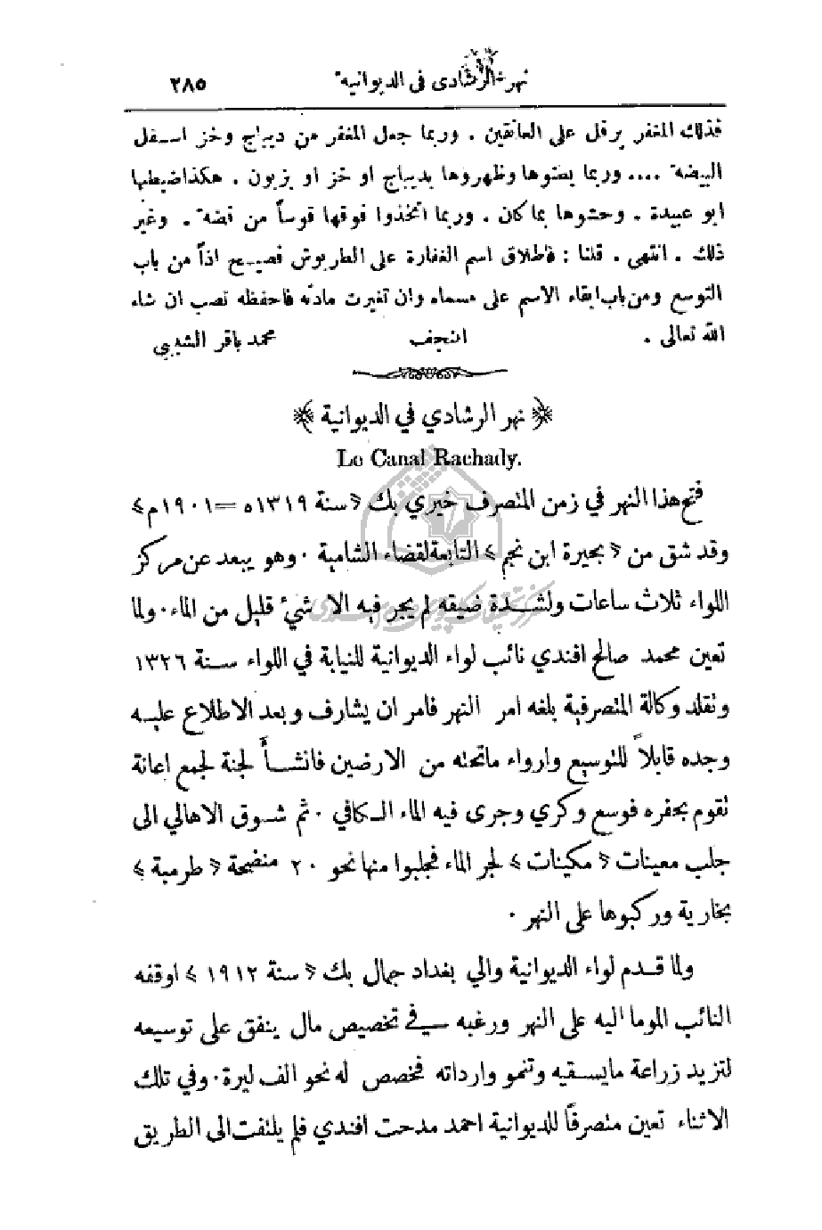 ولما قدم لواء الديوانية والي بغداد جمال بك (سنة 1912) أوقفه النائب الموما إليه على النهر ورغبه في تخصيص مال ينفق على توسيعه لتزيد زراعة ما يسقيه وتنمو وارداته فخصص له نحو ألف ليرة. وفي تلك الأثناء تعين متصرفاً للديوانية أحمد مدحت أفندي فلم يلتفت إلى الطريق