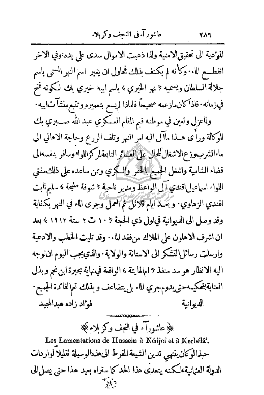 ولما عزل وتعين في موطنه قيم المقام العسكري عبد الله صبري بك للوكالة ورأى هذا ما آل إليه أمر النهر وتلف الزرع وحاجة الأهالي إلى ماء الشرب وزع الأشغال للمحال على العشائر التابعة لمركز اللواء وسافر بنفسه إلى قضاء الشامية وأشغل الجميع بالحفر والكري وممن ساعده على ذلك مفتي اللواء إسماعيل أفندي آل الواعظ ومدير ناحية (شوفة مليحة) سليم ثابت أفندي الزهاوي. وبعد أيام قلائل تم العمل وجرى الماء في النهر بكفاية وقد وصل إلى الديوانية في أول ذي الحجة (10 ت 2 سنة 1912) بعد أن أشرف الأهلون على الهلاك من فقد الماء. وقد تليت الخطب والأدعية وأرسلت رسائل التشكر إلى الآستانة والولاية. والذي يجب اليوم أن نوجه إليه الأنظار هو سد منفذ (أم الهايتة) الواقعة في نهاية