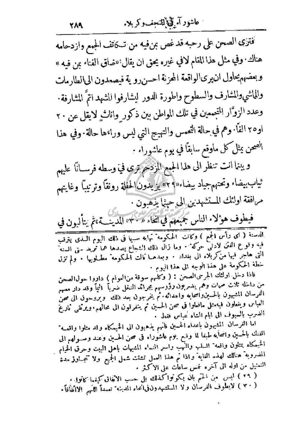 وأطورة الدور ليشارفوا المشهد أتم المشارفة. وعدد الزوار المتجمعين في تلك المواطن بين ذكور وإناث لا يقل عن 20 أو 25 ألفاً. وهم في حالة التحمس والتهيج التي ليس وراءها حالة. وفي هذا الصحن يمثل كل ما وقع سابقاً في يوم عاشوراء.