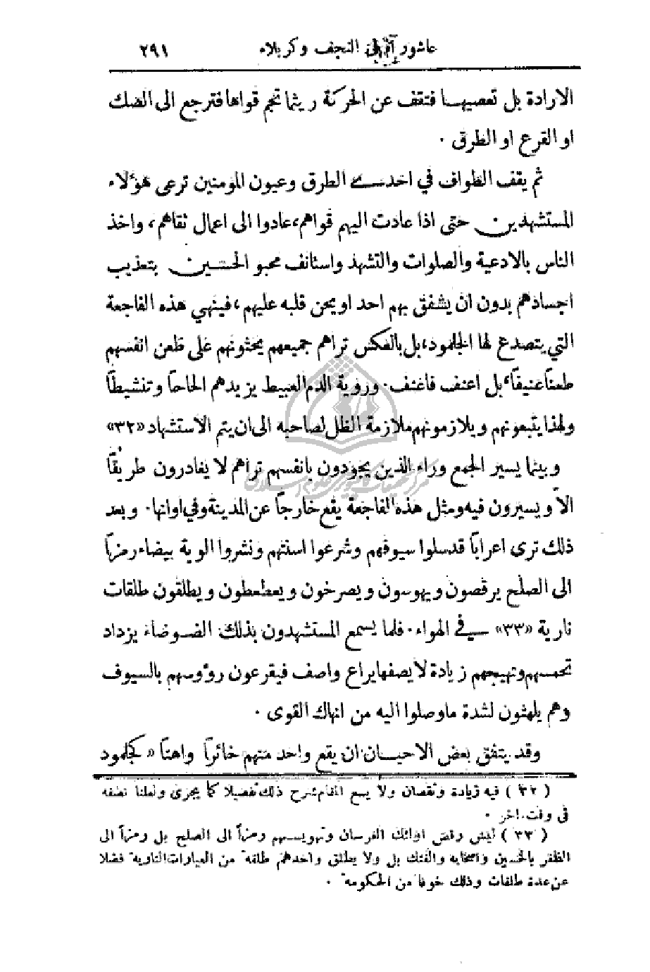 وبينما يسير الجمع وراء الذين يجودون بأنفسهم تراهم لا يغادرون طريقاً إلا ويسيرون فيه ومثل هذه الفاجعة يقع خارجاً عن المدينة وفي أوانها. وبعد ذلك ترى أعراباً قد سلوا سيوفهم وشرعوا أسنتهم ونشروا ألوية بيضاء رمزاً إلى الصلح يرقصون ويهوسون ويصرخون ويعطعطون ويطلقون طلقات نارية في الهواء. فلما يسمع المستشهدون بذلك الضوضاء يزداد تحمسهم وتهيجهم زيادة لا يصفها يراع واصف فيقرعون رؤوسهم بالسيوف وهم يلهثون لشدة ما وصلوا إليه من إنهاك القوى.