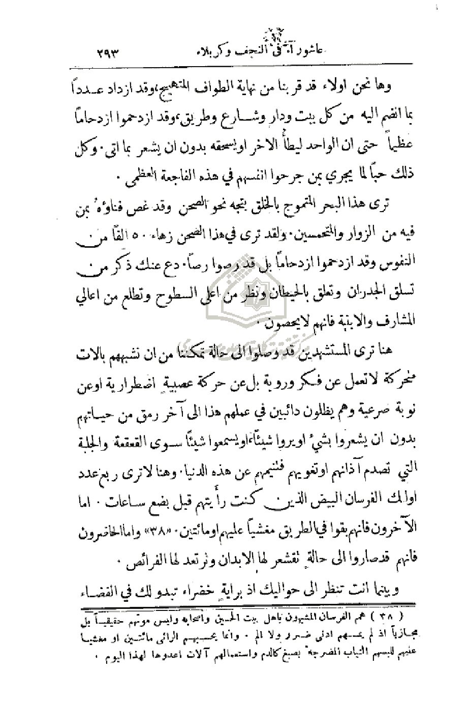 وهانحن أولاء قد قربنا من نهاية الطواف المتهيج، وقد ازداد عدداً بما انضم إليه من كل بيت ودار وشارع وطريق، وقد ازدحموا ازدحاماً عظيماً حتى أن الواحد ليطأ الآخر أو يسحقه بدون أن يشعر بما أتى. وكل ذلك حباً لما يجري بمن جرحوا أنفسهم في هذه الفاجعة العظمى.