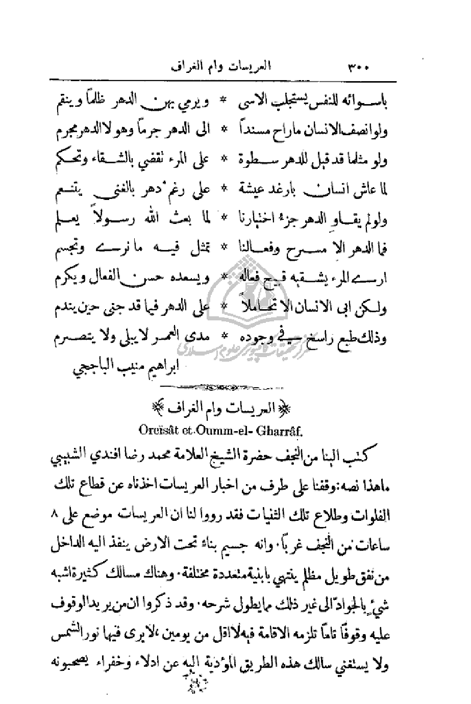 كتب إلينا من النجف حضرة الشيخ العلامة محمد رضا أفندي الشبيبي ما هذا نصه: وقفنا على طرف من أخبار العريسات أخذناه عن قطاع تلك الفلوات وطلاع تلك الثنيات فقد رووا لنا أن العريسات موضع على 8 ساعات من النجف غرباً. وإنه جسيم بناء تحت الأرض ينفذ إليه الداخل من نفق طويل مظلم ينتهي بأبنية متعددة مختلفة. وهناك مسالك كثيرة أشبه شيء بالجواد إلى غير ذلك مما يطول شرحه. وقد ذكروا أن من يريد الوقوف عليه وقوفاً تاماً تلزمه الإقامة فيه لا أقل من يومين، لا يرى فيها نور الشمس ولا يستغني سالك هذه الطريق المؤدية إليه عن إدلاء وخفراء يصحبونه
