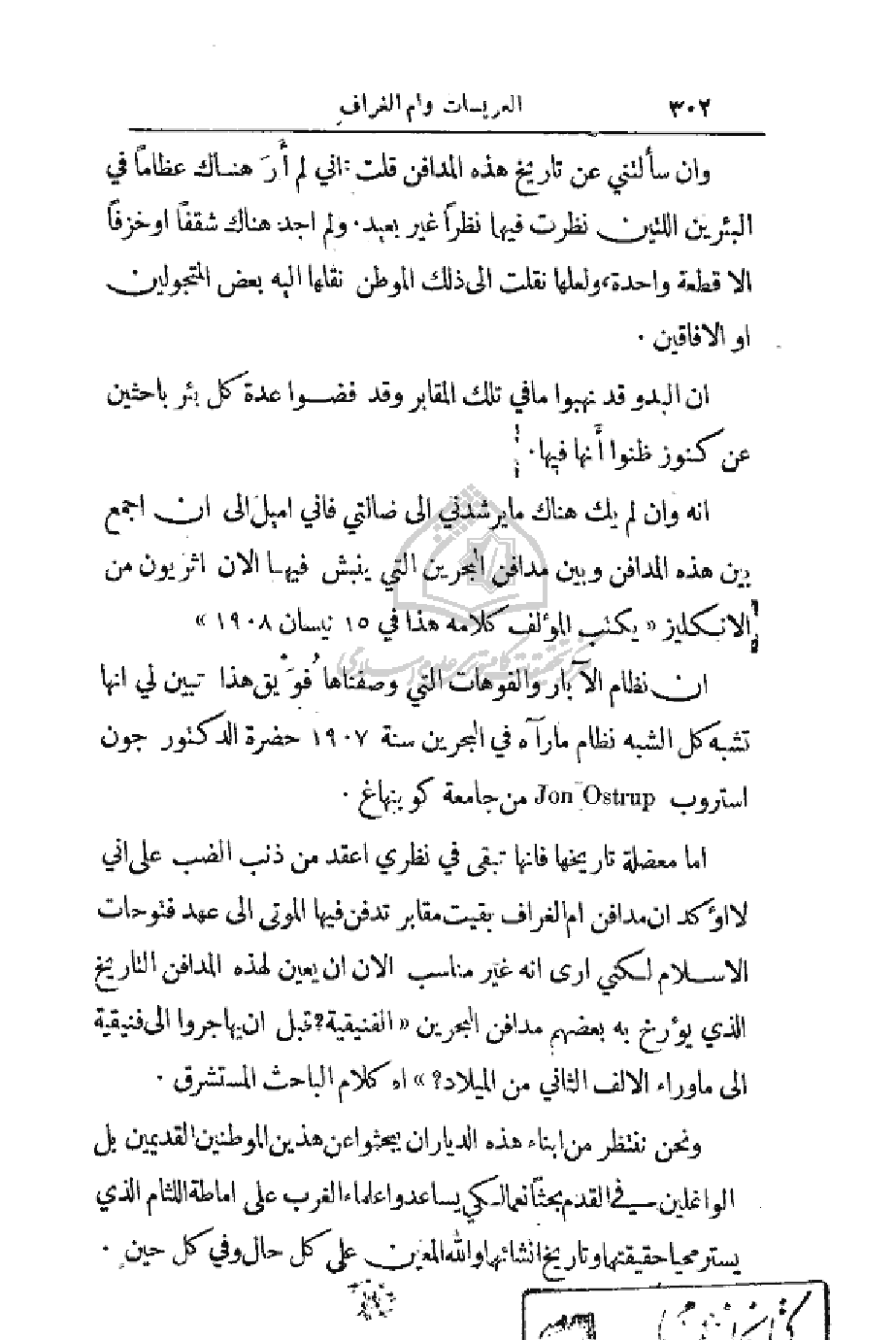 إن نظام الآبار والفوهات التي وصفناها فويق هذا تبين لي أنها تشبه كل الشبه نظام ما رآه في البحرين سنة 1907 حضرة الدكتور جون استروب من جامعة كوبنهاغ.