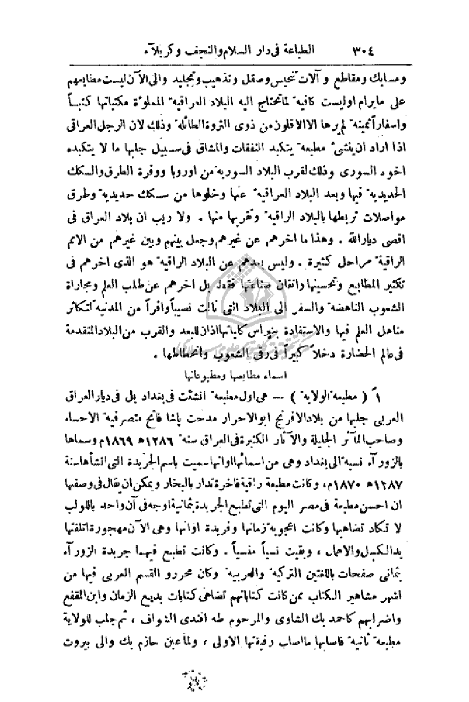 1 - (مطبعة الولاية) - هي أول مطبعة أنشئت في بغداد بل في ديار العراق العربي جلبها من بلاد الإفرنج أبو الأحرار مدحت باشا فاتح متصرفية الاحساء وصاحب المآثر الجليلة والآثار الكثيرة في العراق سنة 1286هـ 1869م وسماها بالزوراء نسبة إلى بغداد وهي من أسمائها أو أنها سميت باسم الجريدة التي أنشأها سنة 1287هـ 1870م، وكانت مطبعة راقية فاخرة تدار بالبخار ويمكن أن يقال في وصفها أن أحسن مطبعة في مصر اليوم التي تطبع الجريدة بثمانية أوجه في آن واحد باللولب لا تكاد تضاهيها وكانت أعجوبة زمانها وفريدة أوانها وهي الآن مهجورة أتلفتها يد الكسل والإهمال، وبقيت نسياً منسياً. وكانت تطبع فيها جريدة لزوراء بثماني صفحات باللغتين التركية والعربية وكان محررو القسم العربي فيها من أشهر مشاهير الكتاب ممن كانت كتاباتهم تضاهي كتابات بديع الزمان وابن المقفع وأضرابهم كأحمد بك الشاوي والمرحوم طه أفندي الشواف، ثم جلب للولاية مطبعة ثانية فأصابها ما أصاب رفيقتها الأولى، ولما عين حازم بك والي بيروت