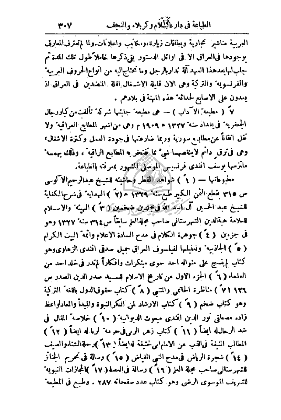 مطبوعاتها - (1) شواهد القطر وحاشيته للشيخ عبد الرحيم السويدي ص 315 بقطع الثمن الكبير طبع سنة 1329هـ (2) الهداية في شرح الكفاية للشيخ عبد الحسين آل أسد الله في مجلدين ضخمين (3) الهيئة والإسلام للعلامة هبة الدين الشهرستاني صاحب مجلة العلم سابقاً ص 314 سنة 1327 وهو في جزءين (4) جوهرة الكلام في مدح السادة الأعلام وأئمة البيت الكرام (5) الجاذبية وتعليلها لفيلسوف العراق جميل صدقي أفندي الزهاوي وهو كتاب لم ينسج على منواله أحد حوى مبتكرات وأفكاراً لم تدر في خلد أحد من العلماء (6) الجزء الأول من تاريخ الإسلام للسيد صدر الدين الصدر ص 126 (7) مناظرة الحاتمي والمتنبي (8) كتاب حقوق الدول باللغة التركية وهو كتاب ضخم (9) كتاب الإرشاد لمن أنكر النبوة والمبدأ والمعاد لواعظ زاده مصطفى نور الدين أفندي مبعوث الديوانية (10) خلاصة المقال في شد الرحال له أيضاً (11) كتاب زهر الربى في حرمة الربا له أيضاً (12) المطالب المنيفة في الذب عن الإمام أبي حنيفة له أيضاً (13) رحلة الشتاء والصيف (14) شجرة الرياض في مدح النبي الفياض (15) رسالة في تحريم الجنائز للشهرستاني صاحب مجلة العلم (16) رسالة في العصا (17) المجازات النبوية للشريف الموسوي الرضى وهو كتاب عدد صفحاته 287. وطبع في المطبعة
