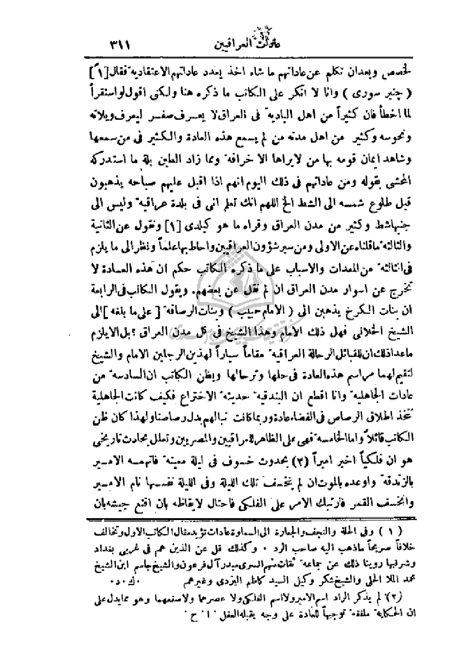 لخصص وبعد أن تكلم عن عاداتهم ما شاء أخذ يعدد عاداتهم الاعتقادية فقال (جنبر سورى) وأنا لا أنكر على الكاتب ما ذكره هنا ولكني أقول لو استقرأ لما أخطأ فإن كثيراً من أهل البادية في العراق لا يعرف صفر ليعرف ويلاته ونحوسه وكثير من أهل مدنه من لم يسمع هذه العادة والكثير في من سمعها وشاهد إيمان قومه بها من لا يراها إلا خرافة ومما زاد الطين بلة ما استدركه المحشى بقوله ومن عاداتهم في ذلك اليوم أنهم إذا أقبل عليهم صباحه يذهبون قبل طلوع شمسه إلى الشط الخ اللهم إنك تعلم أنى في بلدة عراقية وليس إلى جنبها شط وكثير من مدن العراق وقراه ما هو كبلدي ونقول عن الثانية والثالثة ما قلناه عن الأولى وما سبر شؤون العراقيين وأحاط بها علماً ونظر إلى ما يلزم في الثالثة من المعدات والأسباب على ما ذكره الكاتب حكم أن هذه العادة لا تخرج عن أسوار مدن العراق إن لم نقل عن بعضهم. ويقول الكاتب في الرابعة أن بنات الكرخ يذهبن إلى (الإمام حبيب) وبنات الرصافة (على ما بلغه) إلى الشيخ الخلاني فهل ذلك الإمام وهذا الشيخ في كل مدن العراق؟ بل ألا يلزم ما عدا ذلك أن للقبائل الرحالة العراقية مقاماً سياراً لهذين الرجلين الإمام والشيخ لتقيم لهما مراسم هذه العادة في حلها وترحالها ويظن الكاتب أن السادسة من عادات الجاهلية وأنا أقطع أن البندقية حديثة الاختراع فكيف كانت الجاهلية تتخذ إطلاق الرصاص في الفضاء عادة وربما كانت نبالهم بدل رصاصنا ولهذا كان ظن الكاتب قائلاً وأما الخامسة فهي على الظاهر للعراقيين والمصريين وتعلل بحادث تاريخي هو أن فلكياً أخبر أميراً بحدوث خسوف في ليلة معينة فاتهمه الأمير بالزندقة وأوعده بالموت إن لم ينخسف تلك الليلة وفي الليلة نفسها نام الأمير وانخسف القمر فارتبك الأمر على الفلكي فاحتال لإيقاظه بأن أقنع جيشه بأن