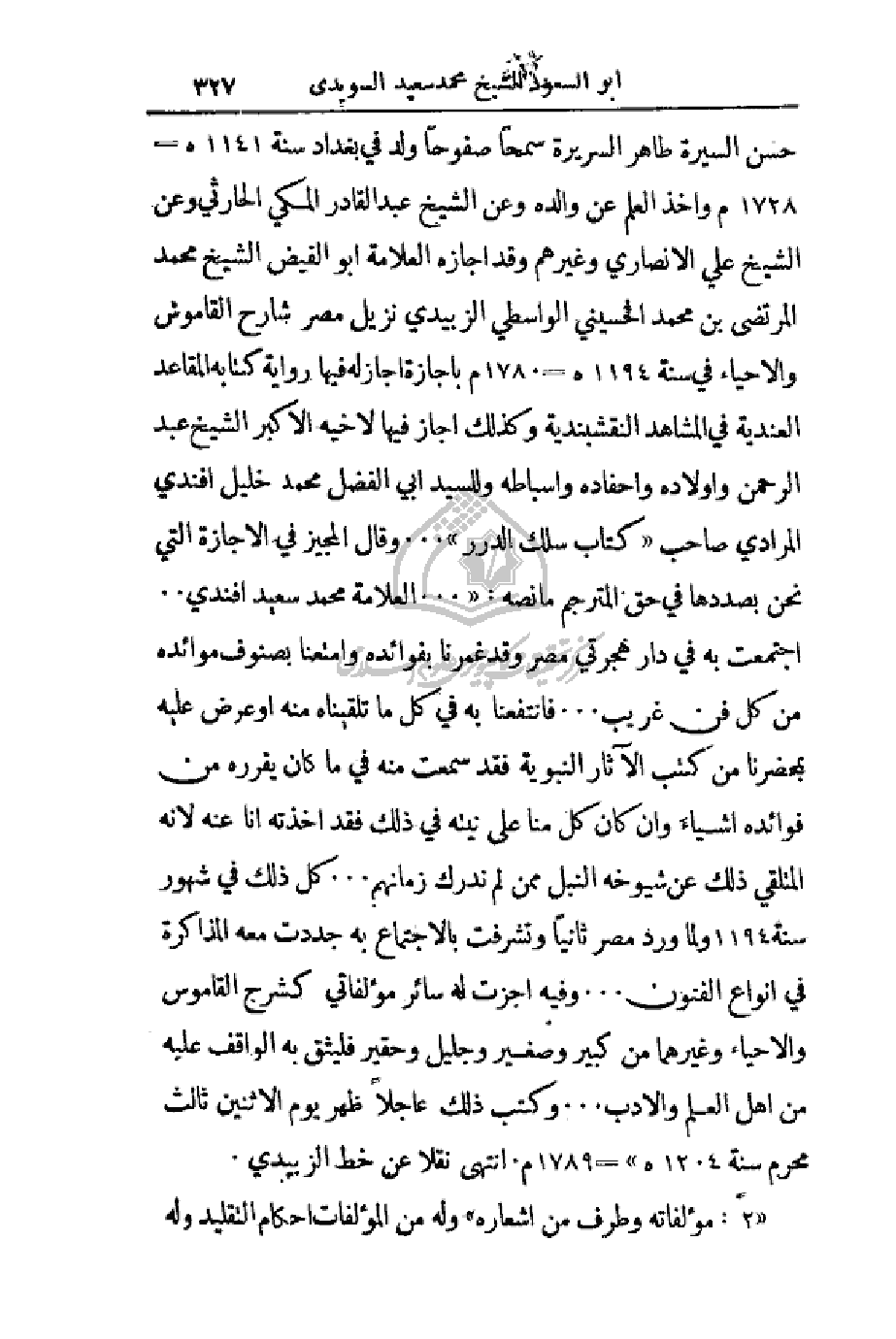 حسن السيرة طاهر السريرة سمحاً صفوحاً ولد في بغداد سنة 1141هـ - 1728م واخذ العلم عن والده وعن الشيخ عبد القادر المكي الحارثي وعن الشيخ علي الأنصاري وغيرهم وقد أجازه العلامة أبو الفيض الشيخ محمد المرتضى بن محمد الحسيني الواسطي الزبيدي نزيل مصر شارح القاموس والأحياء في سنة 1194مه - 1780م بإجازة له فيها رواية كتابه المقاعد العندية في المشاهد النقشبندية وكذلك أجاز فيها لأخيه الأكبر الشيخ عبد الرحمن وأولاده وأحفاده وأسباطه وللسيد أبي الفضل محمد خليل أفندي المرادي صاحب (كتاب سلك الدرر). . . وقال المجيز في الإجازة التي نحن بصددها في حق المترجم ما نصه: (. . . العلامة محمد سعيد أفندي. . اجتمعت به في دار هجرتي مصر وقد غمرنا بفوائده وأمتعنا بصنوف موائده من كل فن غريب. . . فانتفعنا به في كل ما تلقيناه منه أو عرض عليه بمحضرنا من كتب الآثار النبوية فقد سمعت منه في ما كان يقرره من فوائده أشياء وإن كان كل منا على نيته في ذلك فقد أخذته أنا عنه لأنه المتلقي ذلك عن شيوخه النيل ممن لم ندرك زمانهم. . . كل ذلك في شهور سنة 1194 ولما ورد مصر ثانياً وتشرفت بالاجتماع به جددت معه المذاكرة في أنواع الفنون. . . وفيه أجزت له سائر مؤلفاتي كشرح القاموس والأحياء وغيرهما من كبير وصغير وجليل وحقير فليثق به الواقف عليه من أهل العلم والأدب. . . وكتب ذلك عاجلاً ظهر يوم الاثنين ثالث محرم سنة 1204هـ - 1789م.) انتهى نقلا عن خط الزبيدي.