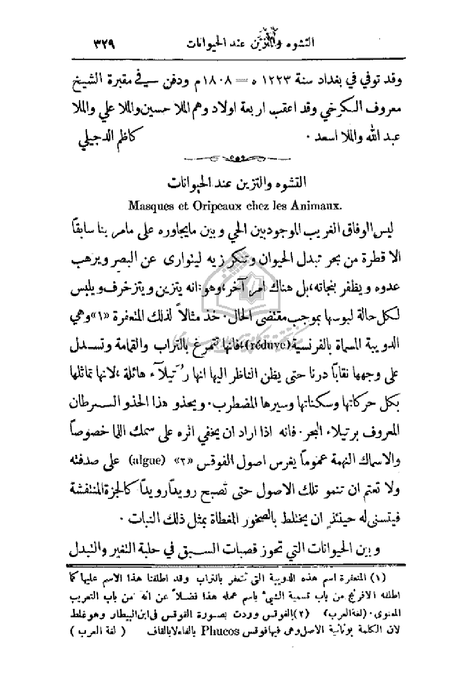 ليس الوفاق الغريب الموجود بين الحي وبين ما يجاوره على ما مر بنا سابقاً إلا قطرة من بحر تبدل الحيوان وتنكر زيه ليتوارى عن البصر ويرهب عدوه ويظفر بنجاته، بل هناك أمر آخر، وهو أنه يتزين ويتزخرف ويلبس لكل حالة لبوسها بموجب مقتضى الحال. خذ مثالاً لذلك المتعفرة وهي الدويبة المسماة بالفرنسية فأنها تتمرغ بالتراب والقمامة وتسدل على وجهها نقاباً درنا حتى يظن الناظر إليها أنها رتَيلاء هائلة، لأنها تماثلها بكل حركاتها وسكناتها وسيرها المضطرب. ويحذو هذا الحذو السرطان المعروف برتيلاء البحر. فإنه إذا أراد أن يختفي أثره على سمك اللما خصوصاً والأسماك النهمة عموماً يغرس أصول الفوقس على صدفته ولا تعتم أن تنمو تلك الأصول حتى تصبح رويداً رويداً كالجزة المنتفشة فيتسنى له حينئذٍ أن يختلط بالصخور المغطاة بمثل ذلك النبات.