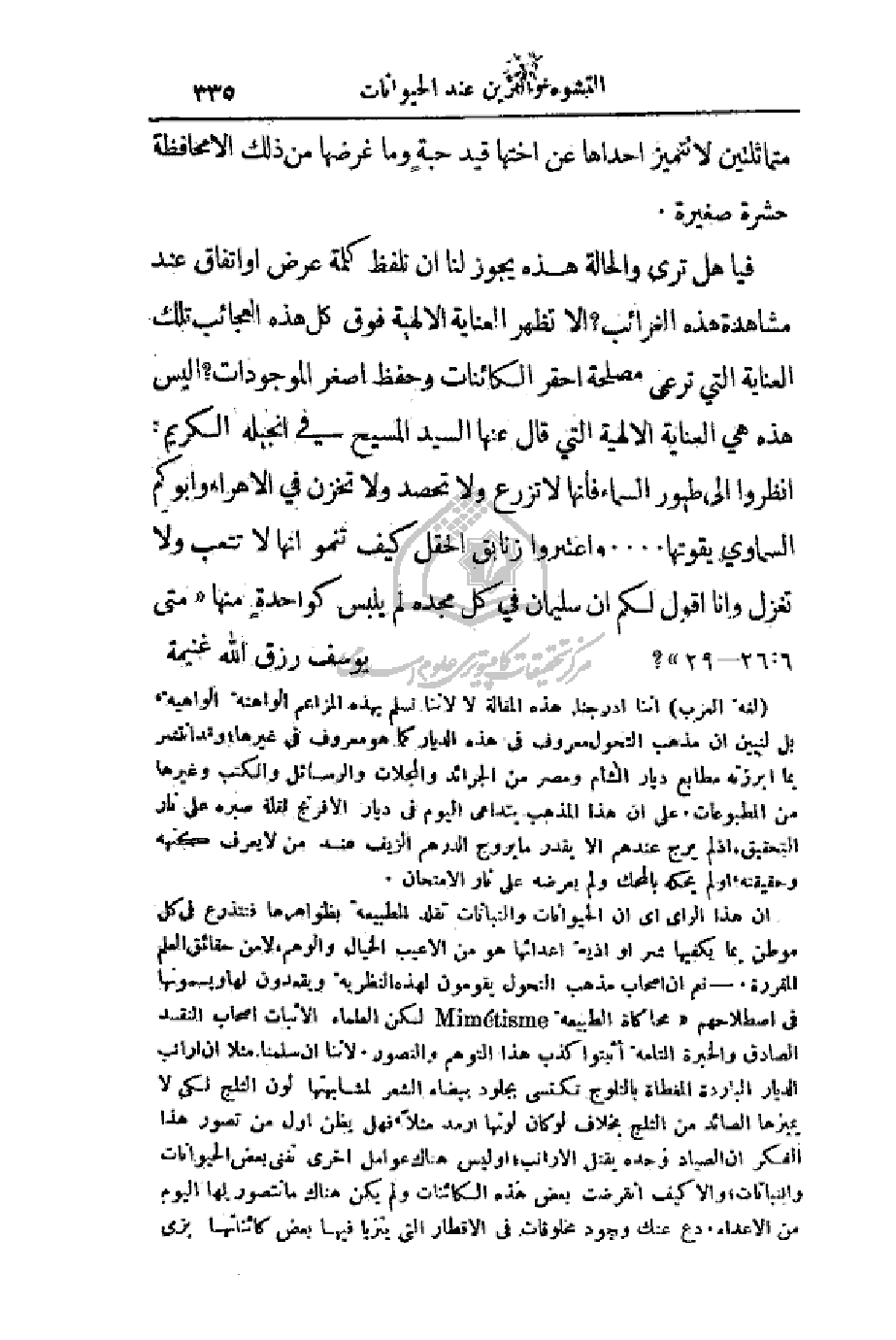 فيا هل ترى والحالة هذه يجوز لنا أن نلفظ كلمة عرض أو اتفاق عند مشاهدة هذه الغرائب؟ إلا تظهر العناية الإلهية فوق كل هذه العجائب تلك العناية التي ترعى مصلحة أحقر الكائنات وحفظ أصغر الموجودات؟ أليس هذه هي العناية الإلهية التي قال عنها السيد المسيح في إنجيله الكريم: انظروا إلى طيور السماء فإنها لا تزرع ولا تحصد ولا تخزن في الاهراء وأبوكم السماوي يقوتها. . . واعتبروا زنابق الحقل كيف تنمو أنها لا تتعب ولا تغزل وأنا أقول لكم أن سليمان في كل مجده لم يلبس كواحدةٍ منها (متى 26: 6 - 29)